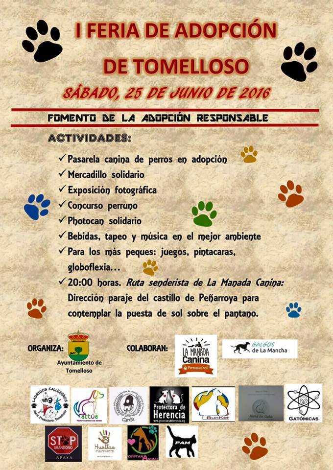 – HOY día 25 de Junio se celebrara la I FERIA DE ADOPCIÓN DE TOMELLOSO, en el parque de la Constitución desde las 12:00h En este evento además de dar información contaremos con varias actividades: * Pasarela perruna de animales…
