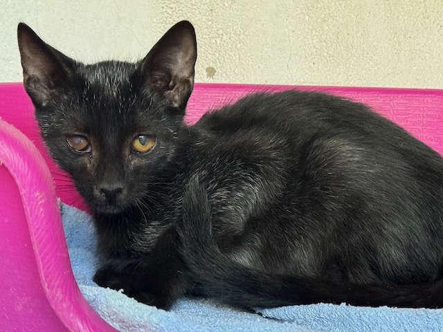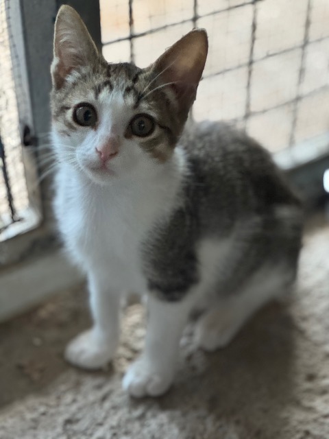 Esté gatito entró muy enfermo y con los ojos horrible, uno lo ha recuperado totalmente y por el otro creemos que no ve. Está un poco asustado en el albergue pero es muy bueno. Es de julio de 2025