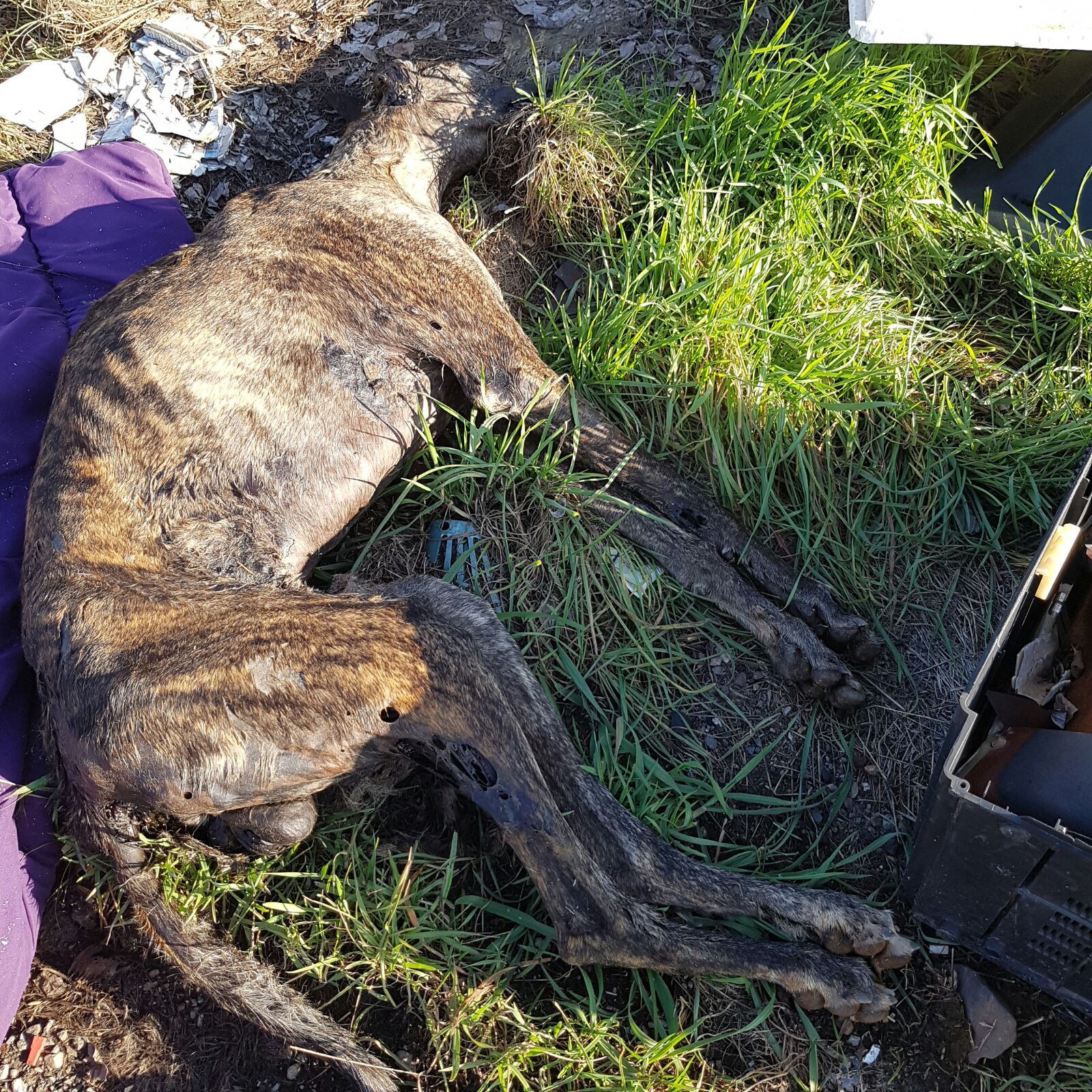Nos hemos encontrado en el antiguo barrio minero de Asdrúbal este galgo, ya muerto. No tenía signos aparentes de violencia (golpes, ahorcamientos, atropello…) pero al tratarse este paraje de un lugar accesible aunque abandonado, sospechamos que lo han dejado allí ya muerto. Se trata de un de un galgo macho, adulto, enorme, majestuoso….y como les pasa a muchos galgos y otros perros de caza por estas fechas en las que la temporada de caza se acaba, quizá su dueño estimó que ya había dado lo mejor de sí mismo y que había llegado el momento de, simplemente, dejar de ser una carga, de ser una herramienta de trabajo a su antojo.