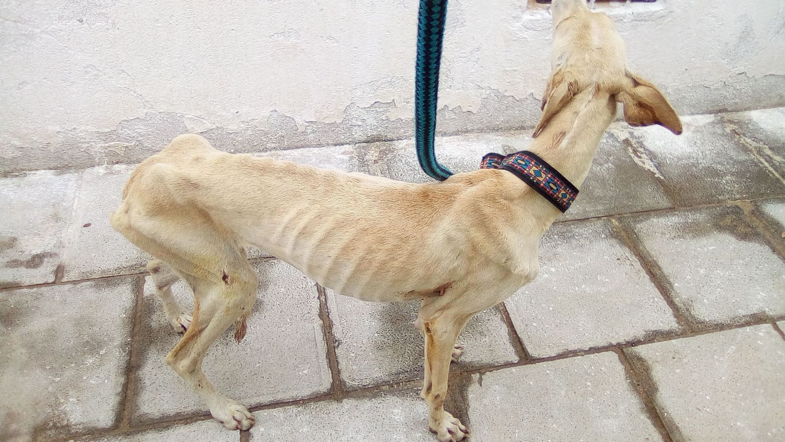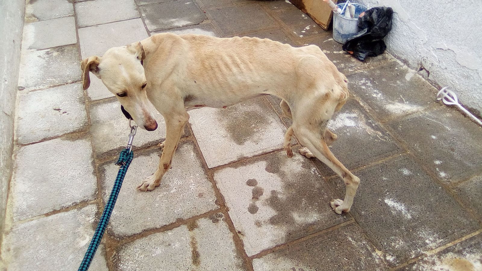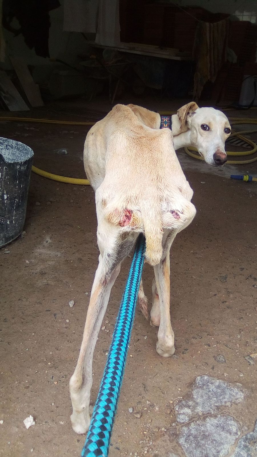 Breda es una galguita que tendrá como mucho 1 año y medio, y que se ha encontrado en este estado lamentable, ha sido abandonada por uno de esos galgueros que “quieren tanto a sus perros”.