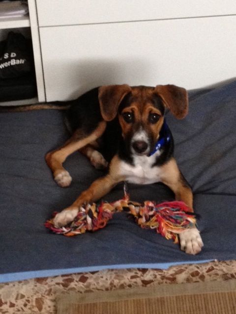 Nacio en abril de 2012, no crecerá mucho, será tamaño mediano, el veterinario ha dicho que como mucho unos 20 kilos