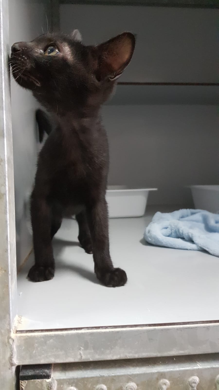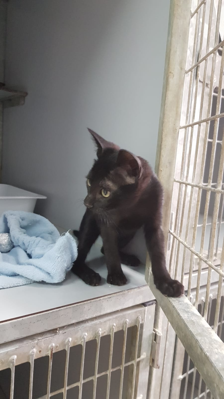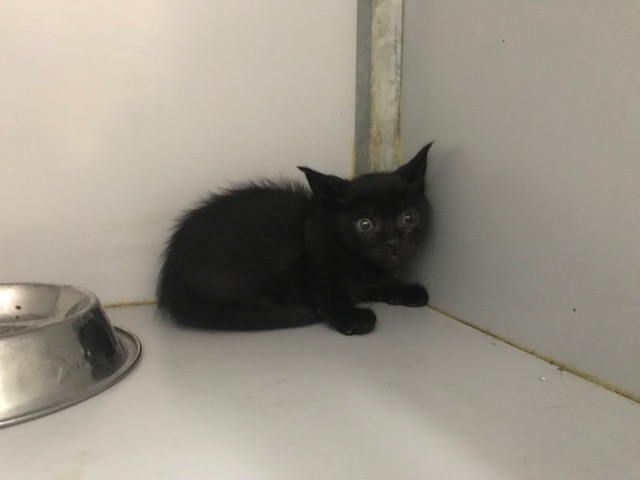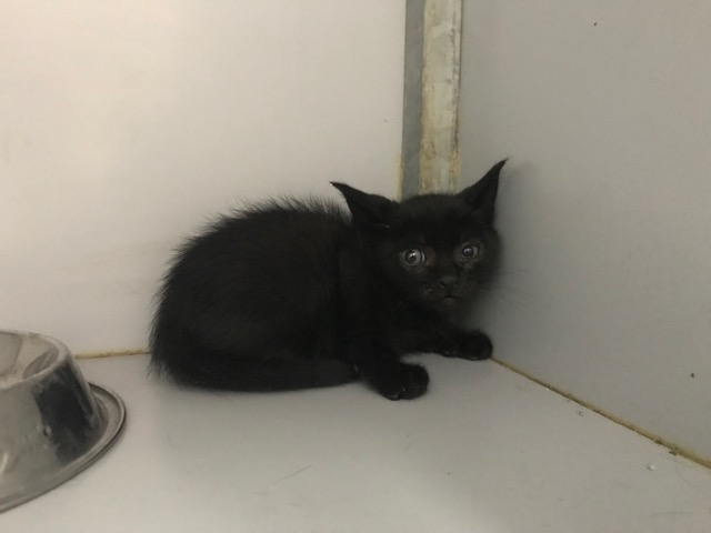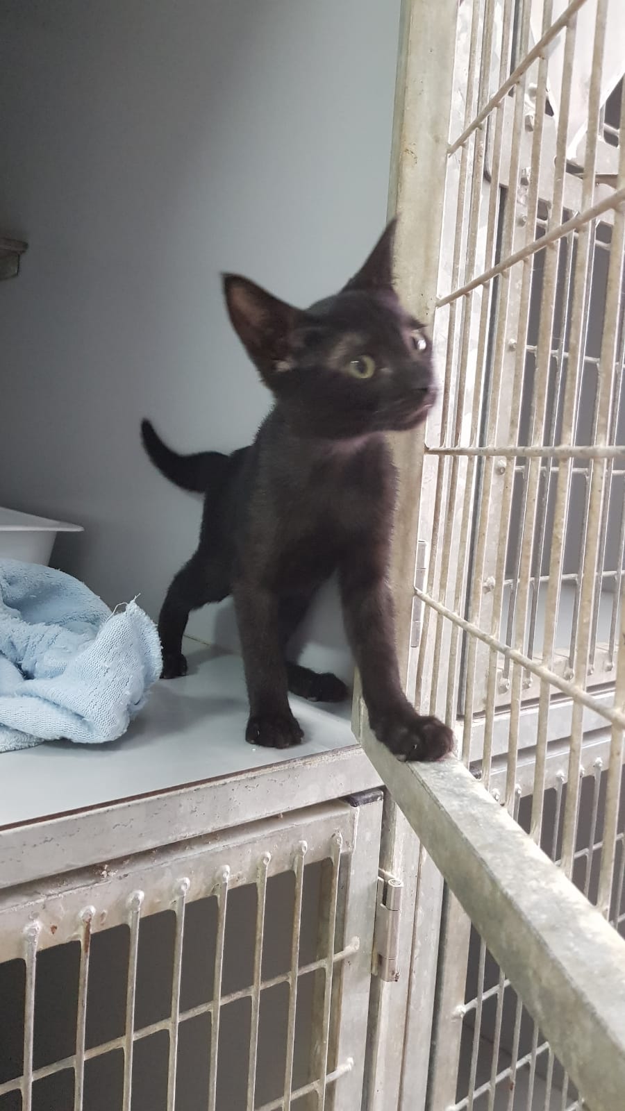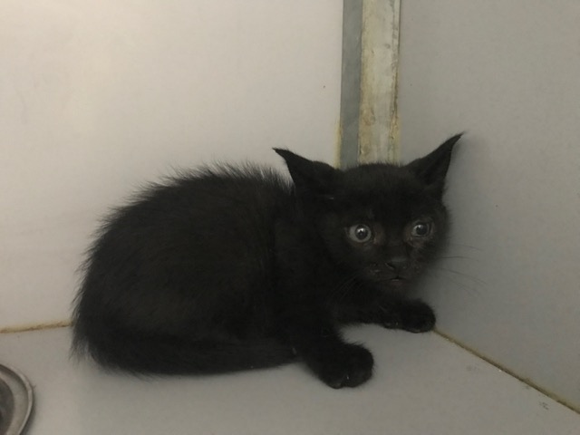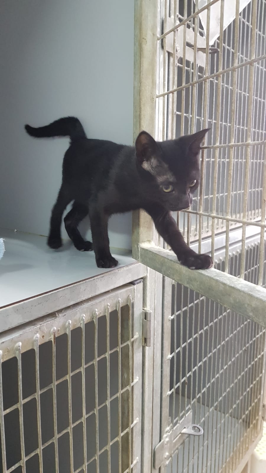 Es muy bueno y está asustadito, está en un jaulón porque es muy chiquitín y no hay otro sitio para él, el albergue está saturado de perros y también de gatos.