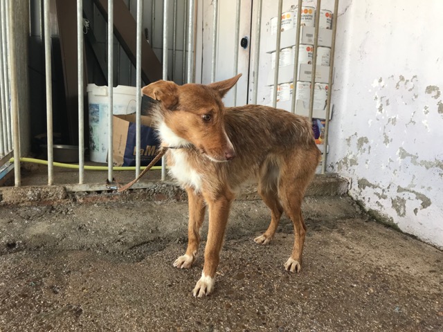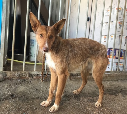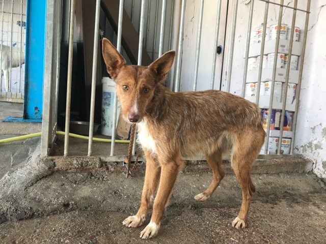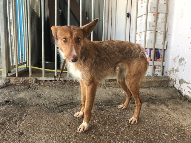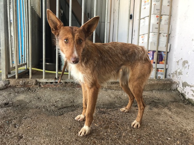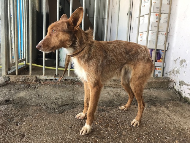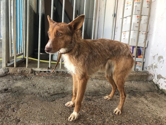 ebel es una podenca que estaba abandonada cerca del albergue, eramos incapaces de cogerla, pero se le creo una rutina y acudia al mismo sitio a comer, aunque vienieron los voluntarios de ERA con su jaula trampa, no consiguieron atraparla hasta la quinta vez.