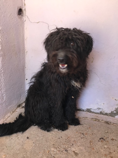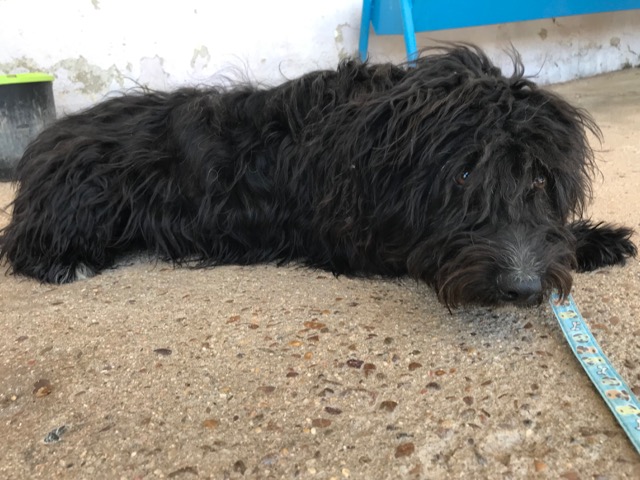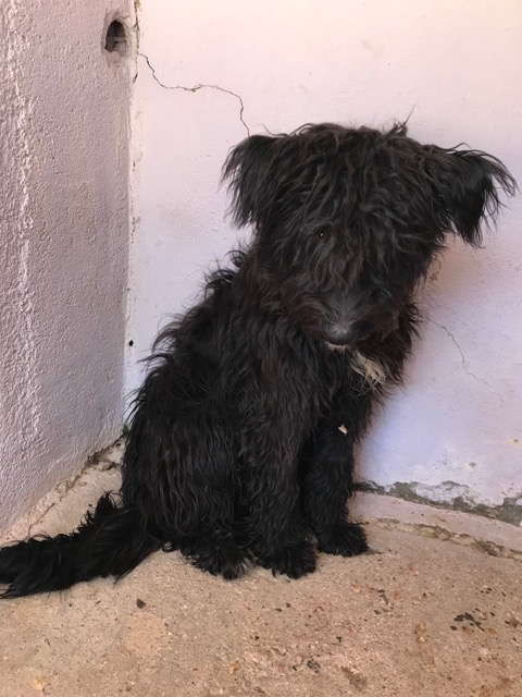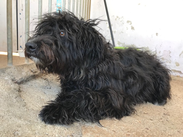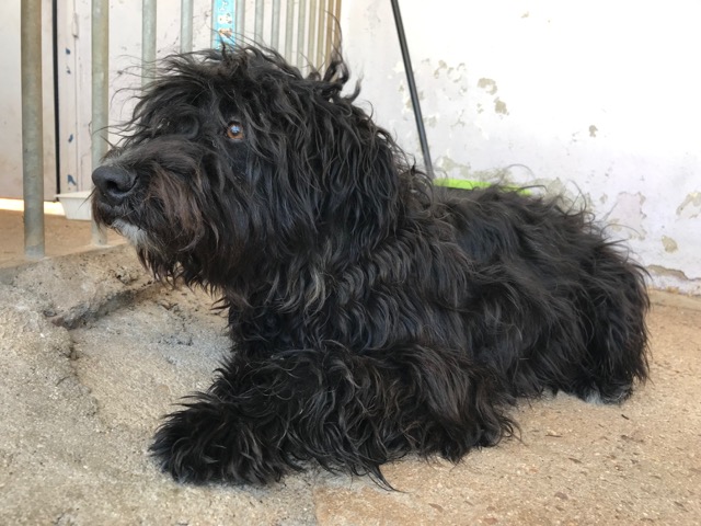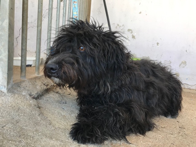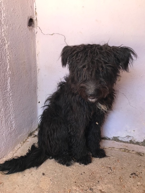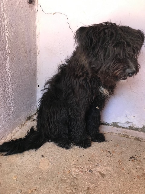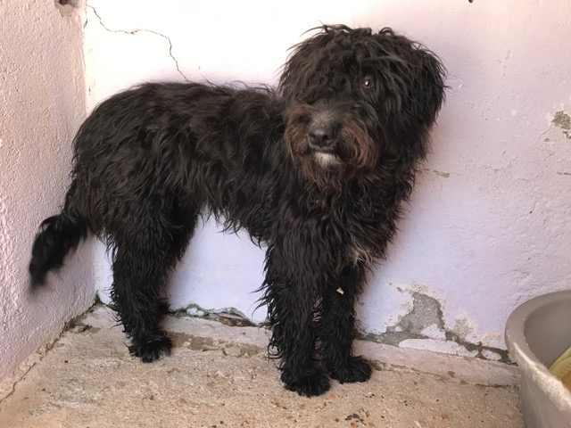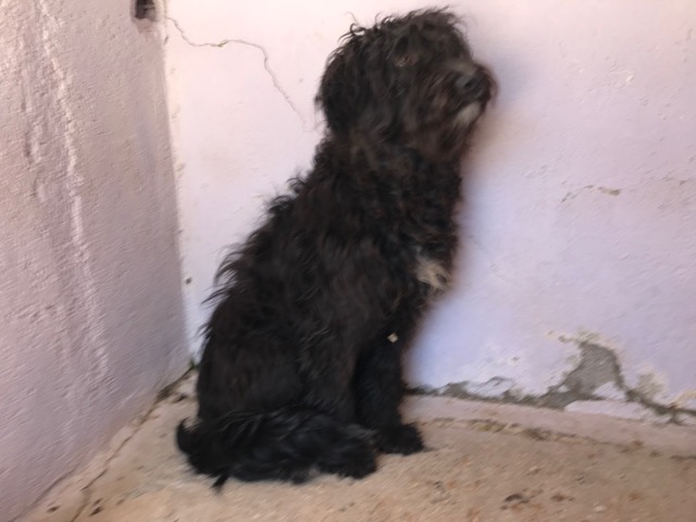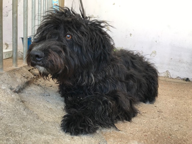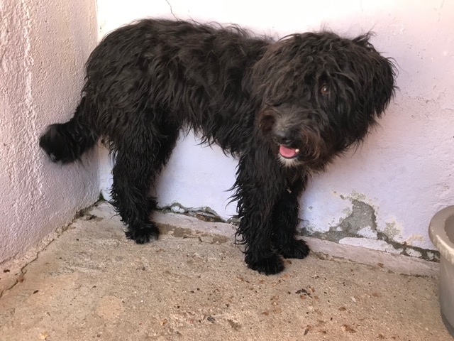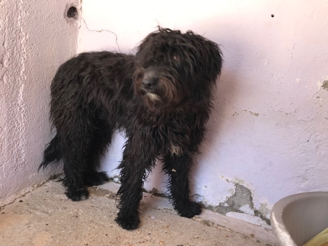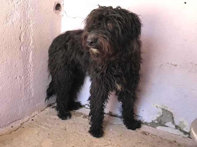 Es de los perros que con más miedo han llegado al albergue, se paraliza en un rincón si te acercas, pero al ratito sale a olerte discretamente, y le gusta que le acaricies, pero ante cualquier movimiento minimamente brusco se encoge otra vez.