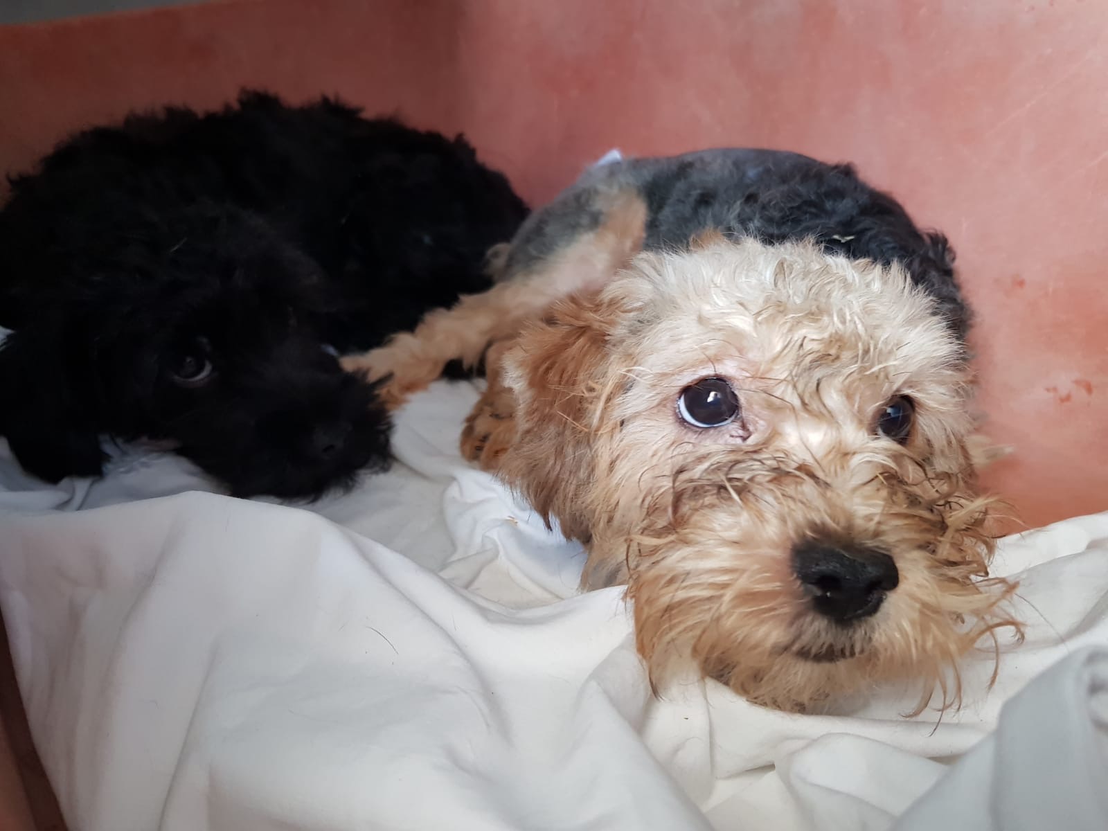 Los dos están muertos de miedo, no sabemos que les han hecho para que tengan ese miedo, pero si los coges y abrazas les encanta, no se despegan de ti, se quedan acurrucaditos y tranquilitos.