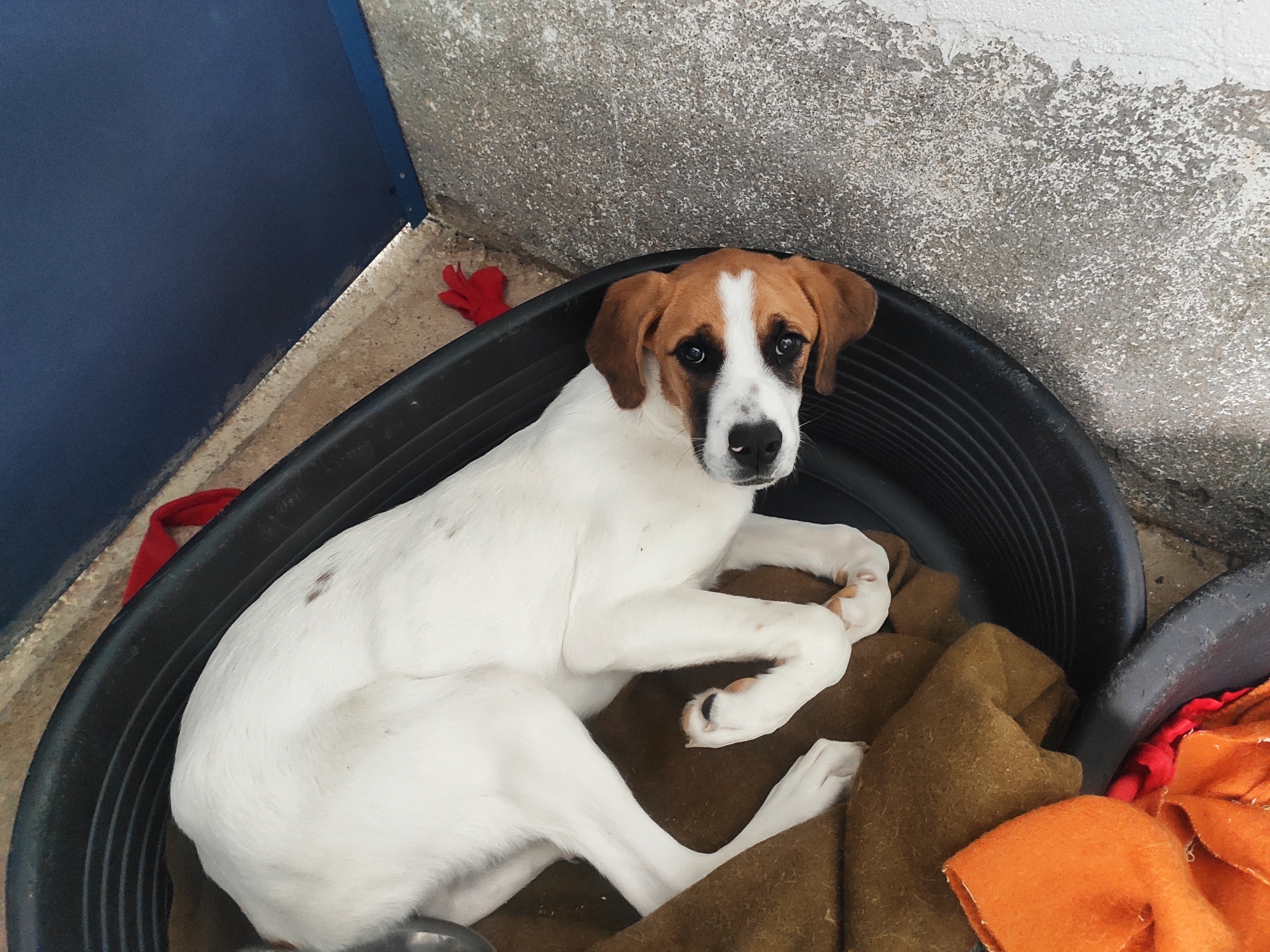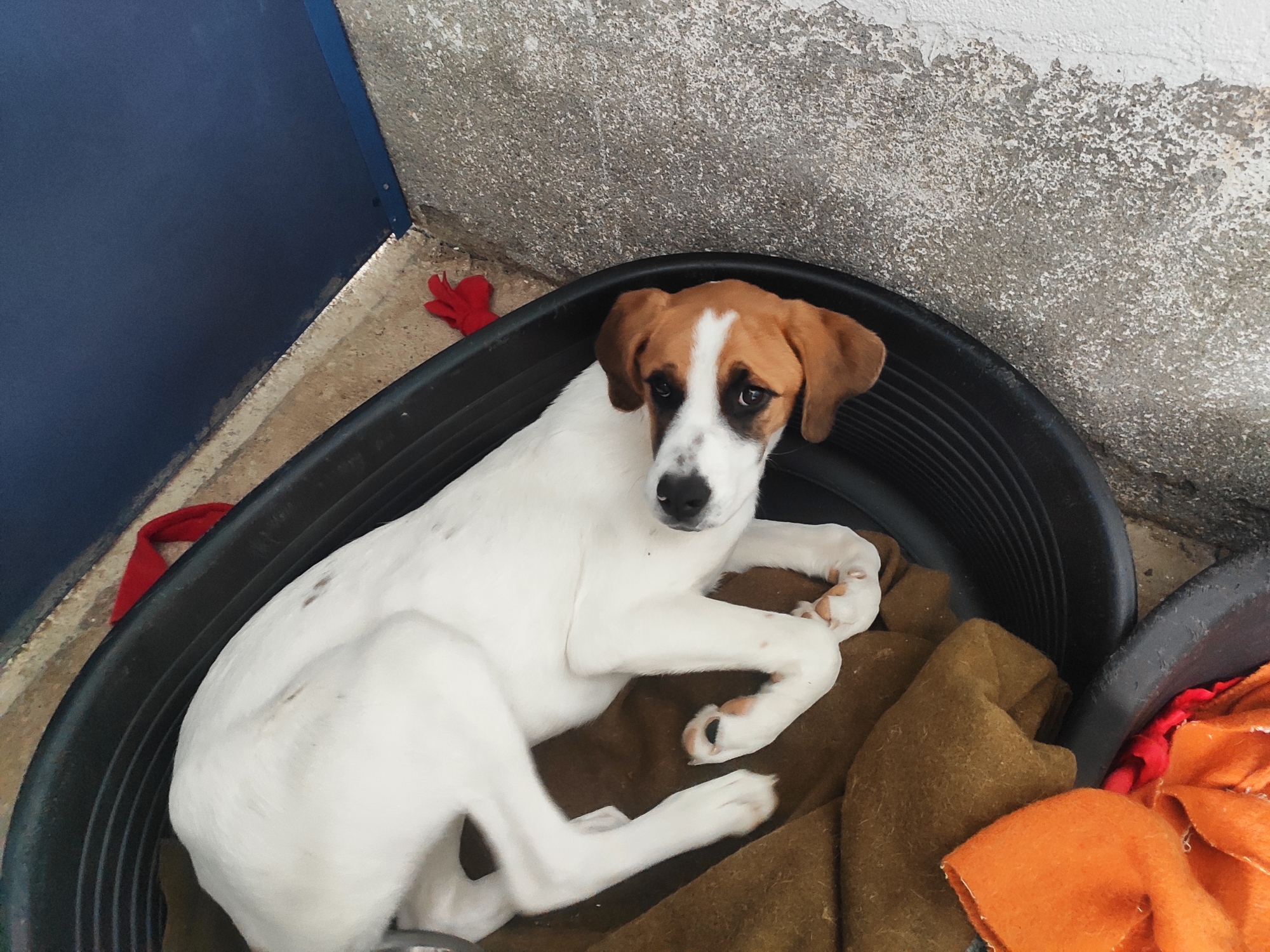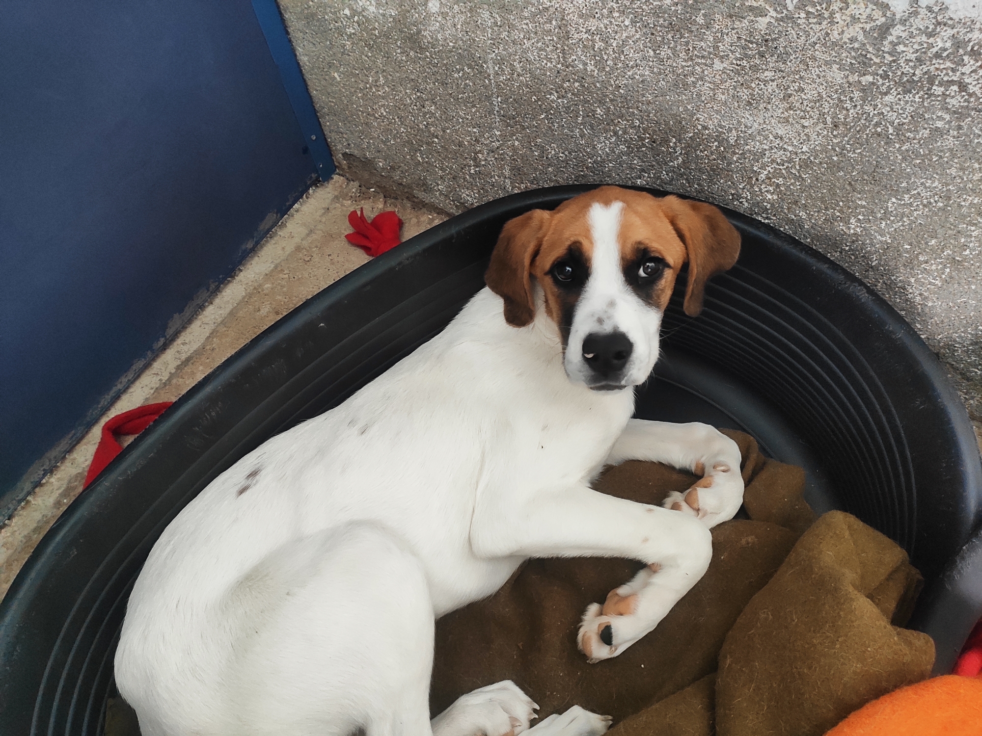 Yvon llego al albergue con Indigo dos cachorros que ya han sufrido el abandono, nos dieron aviso de que habían visto a un coche tirar a la carretera dos perros cerca del albergue se fueron a buscar pero no vimos ni rastro, al día siguiente cuando los voluntarios íbamos al albergue los fuimos a buscar de nuevo y estaban metidos en el río, una de nuestras voluntarias Holandesa no dudó en meterse a por uno de ellos, estaban hasta arriba de barro y lodo, y con los rabos recién cortados que tuvieron que ser llevados de urgencias al veterinario tras la revisión fueron lavados y curados y ahora están con medicación. Tienen un miedo horrible pero sabemos que será cuestión de tiempo y que poco a poco irán cambiando, son muy jóvenes y tienen que tener su oportunidad.