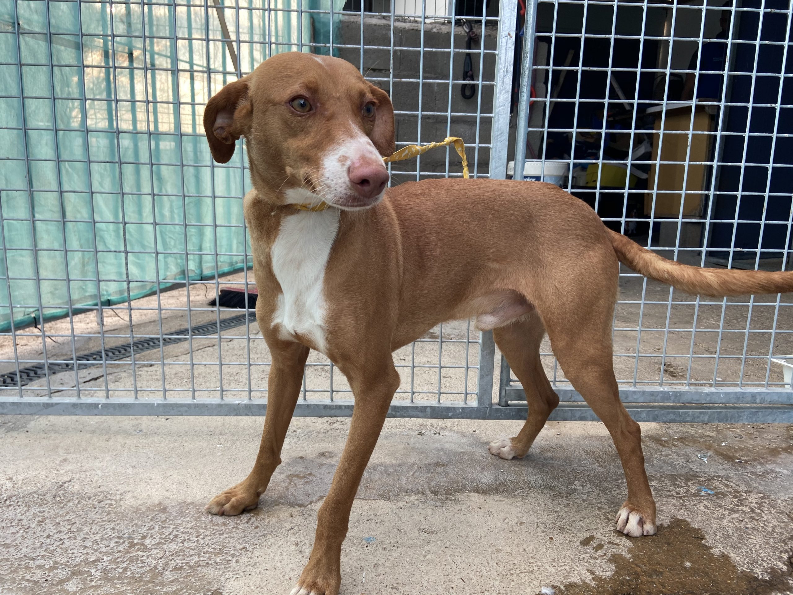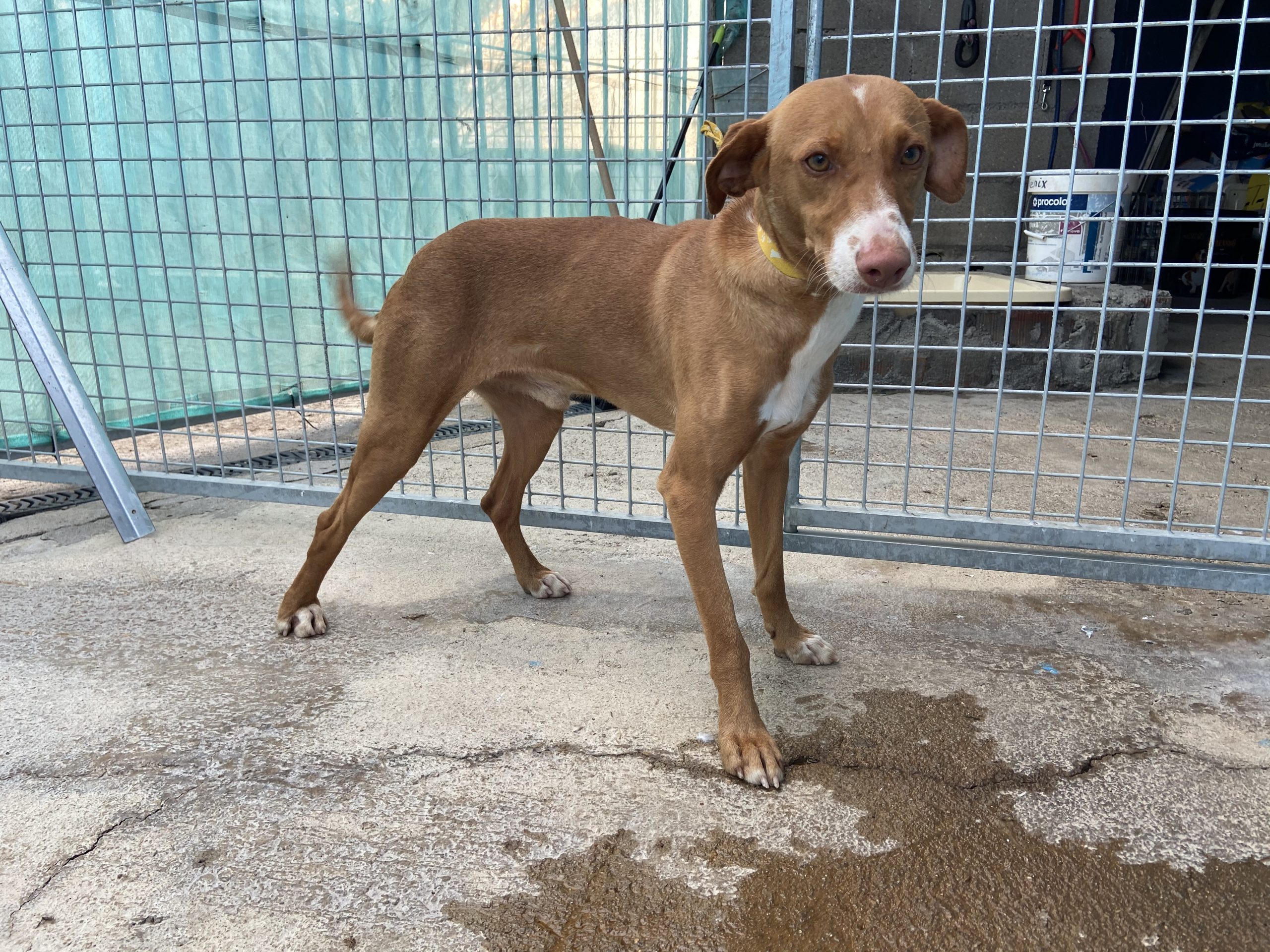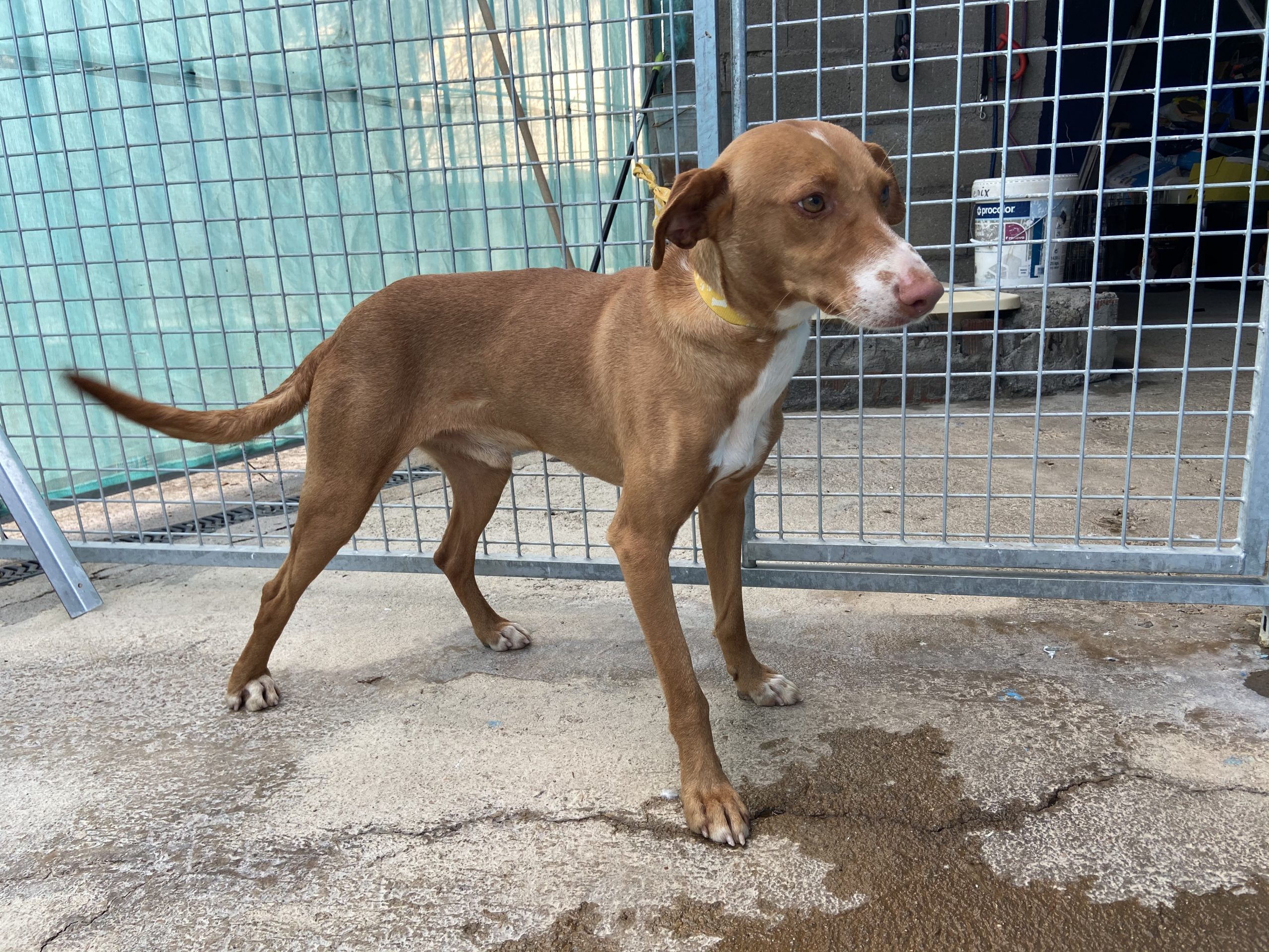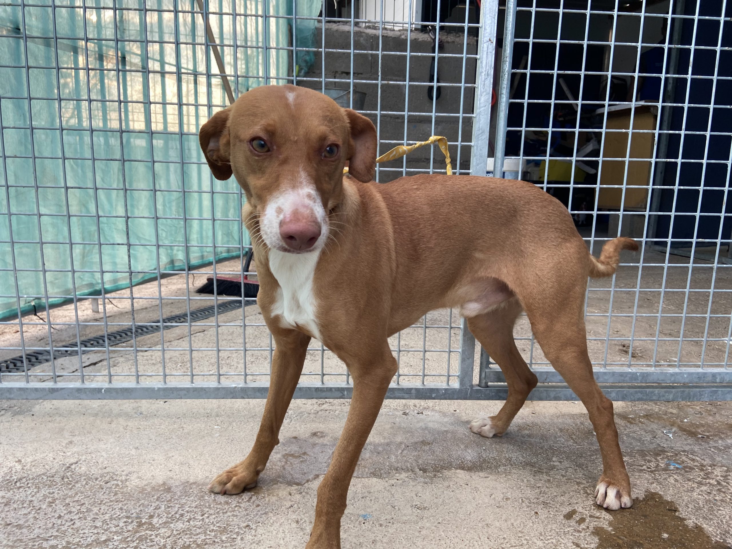 Romero es un podenco muy bueno y jovencito que andaba solo por el paseo.