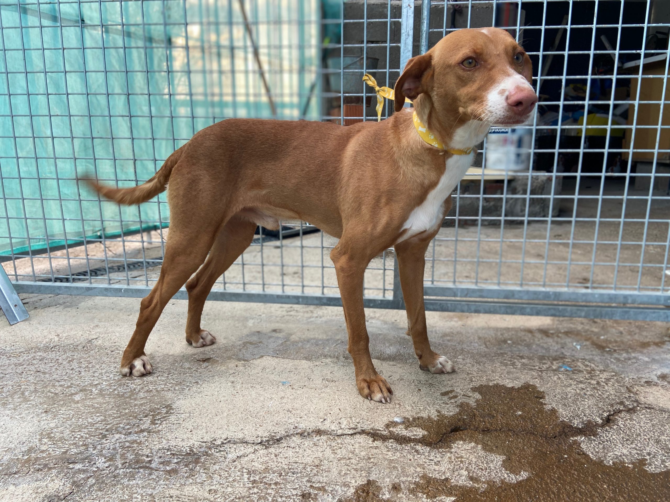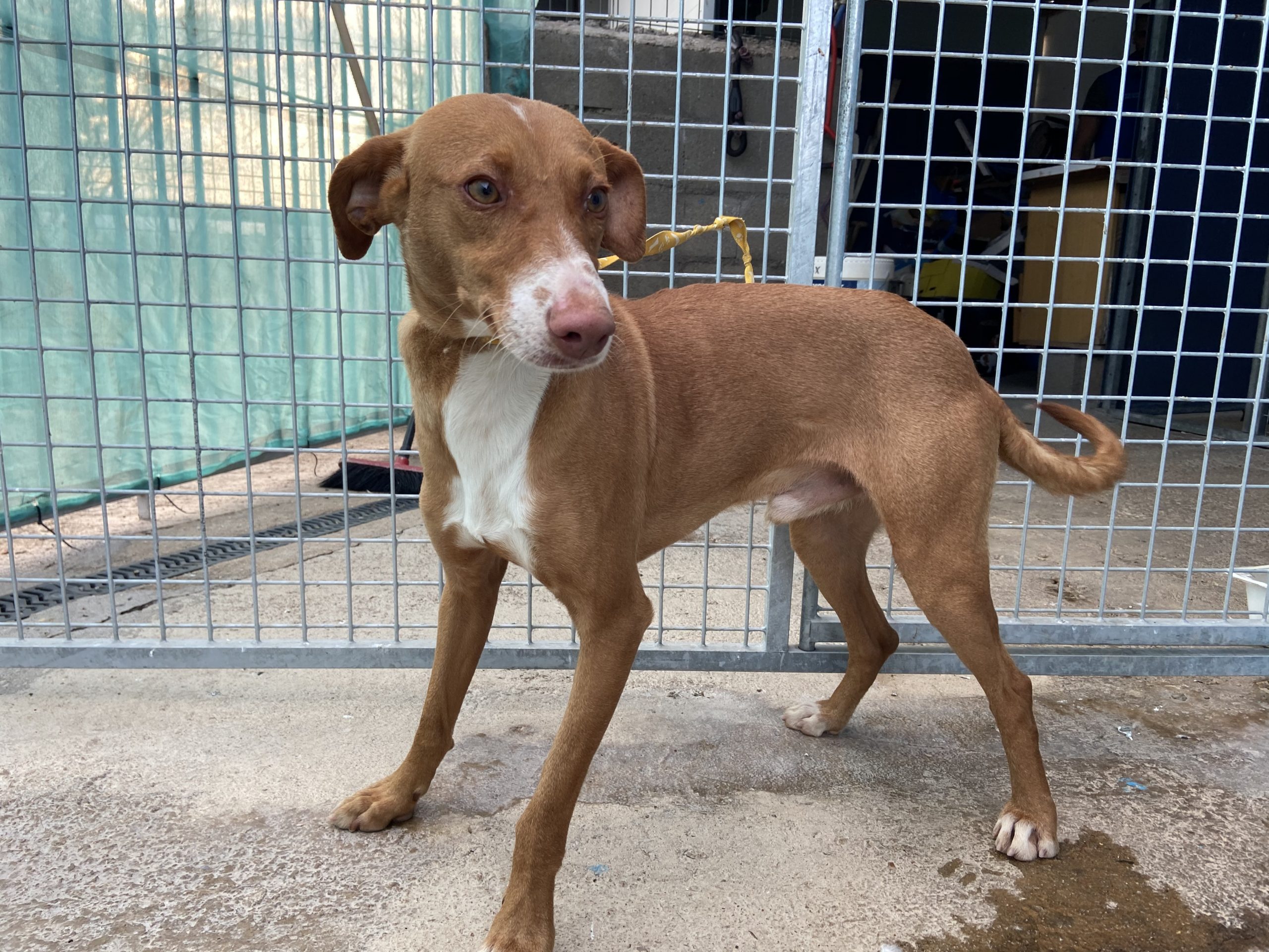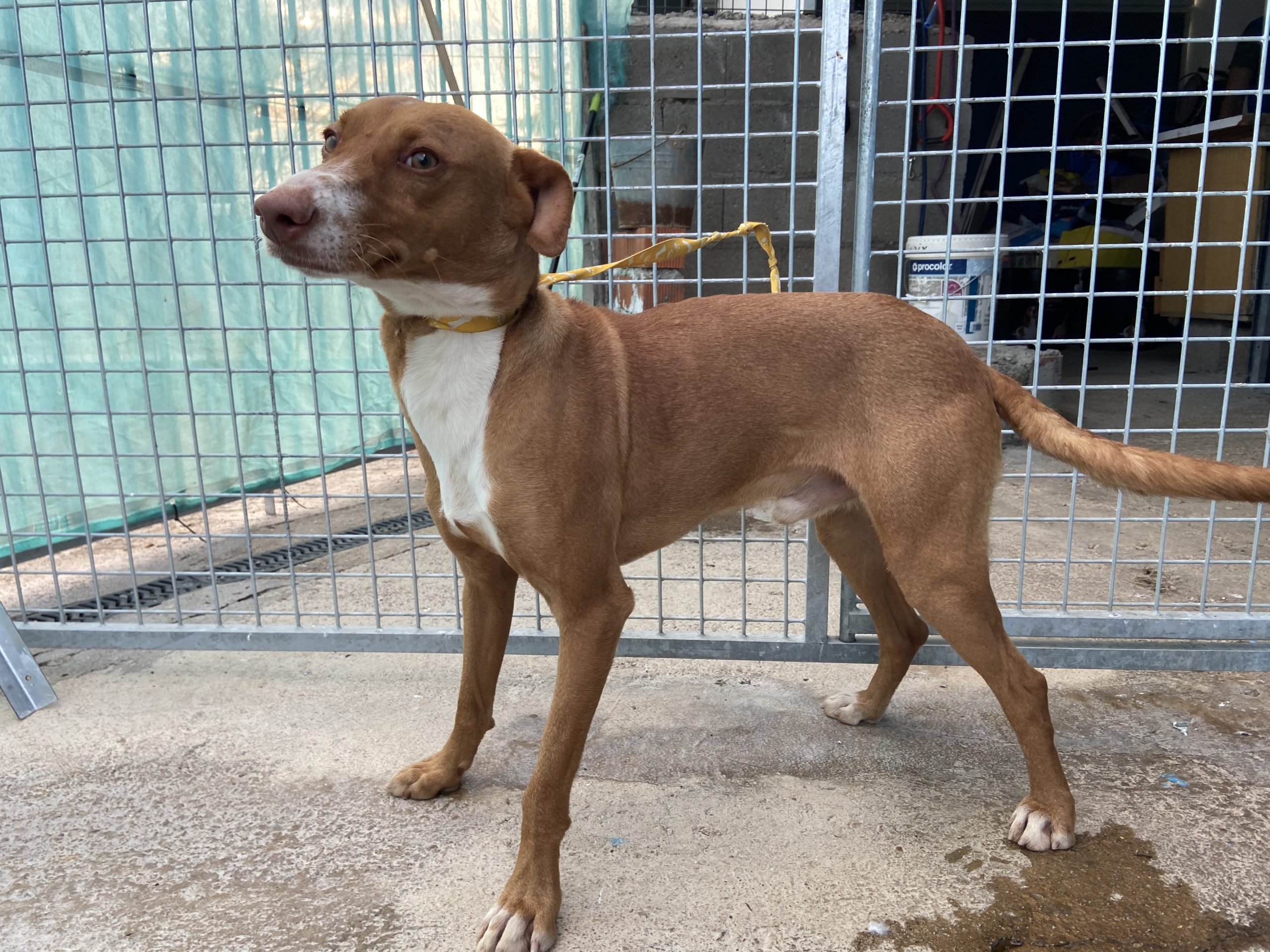 Romero es un podenco muy bueno y jovencito que andaba solo por el paseo.