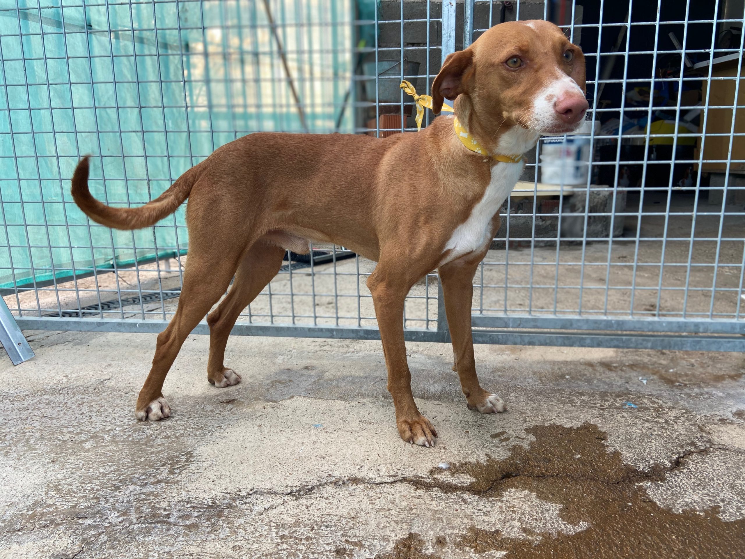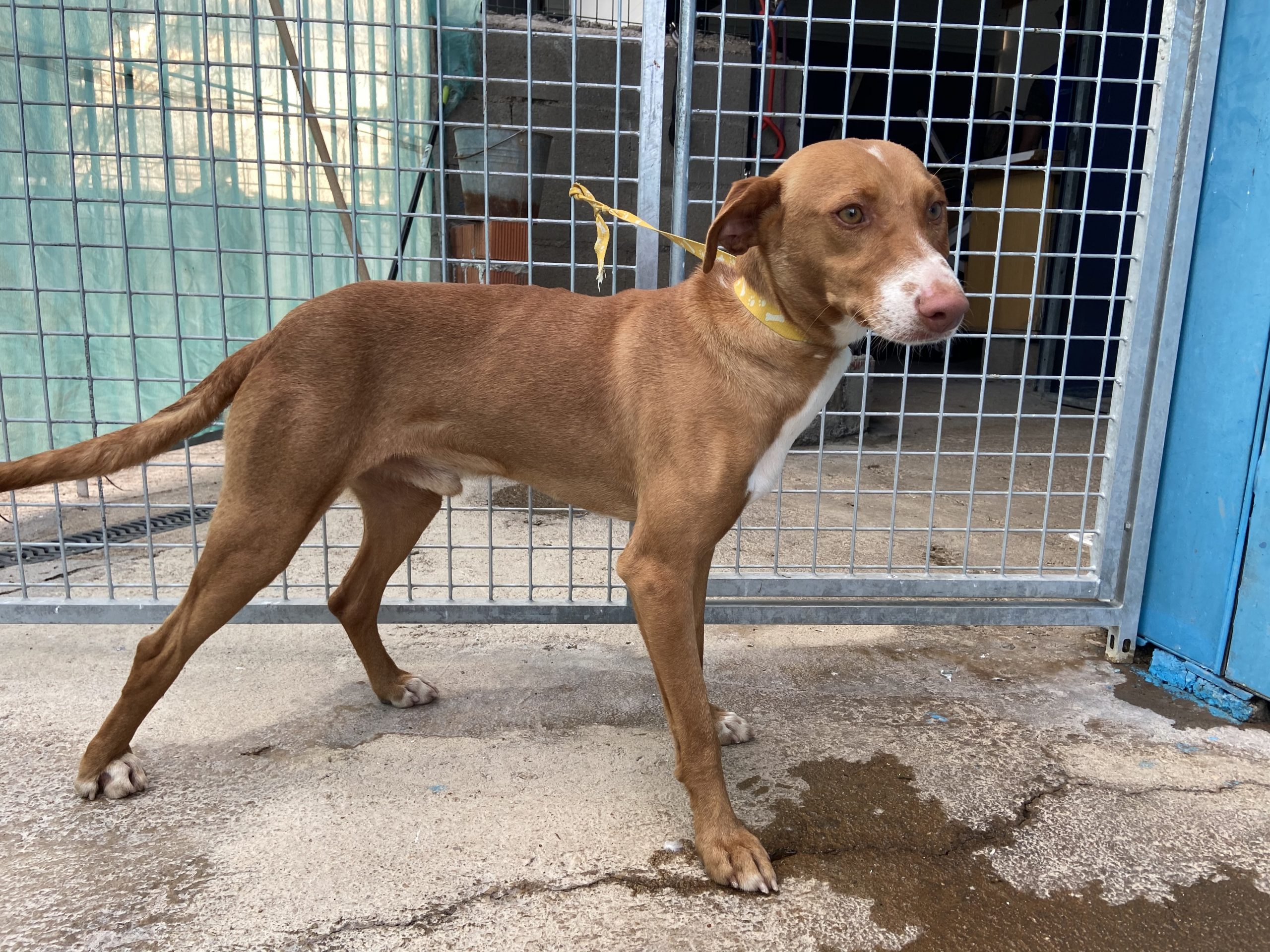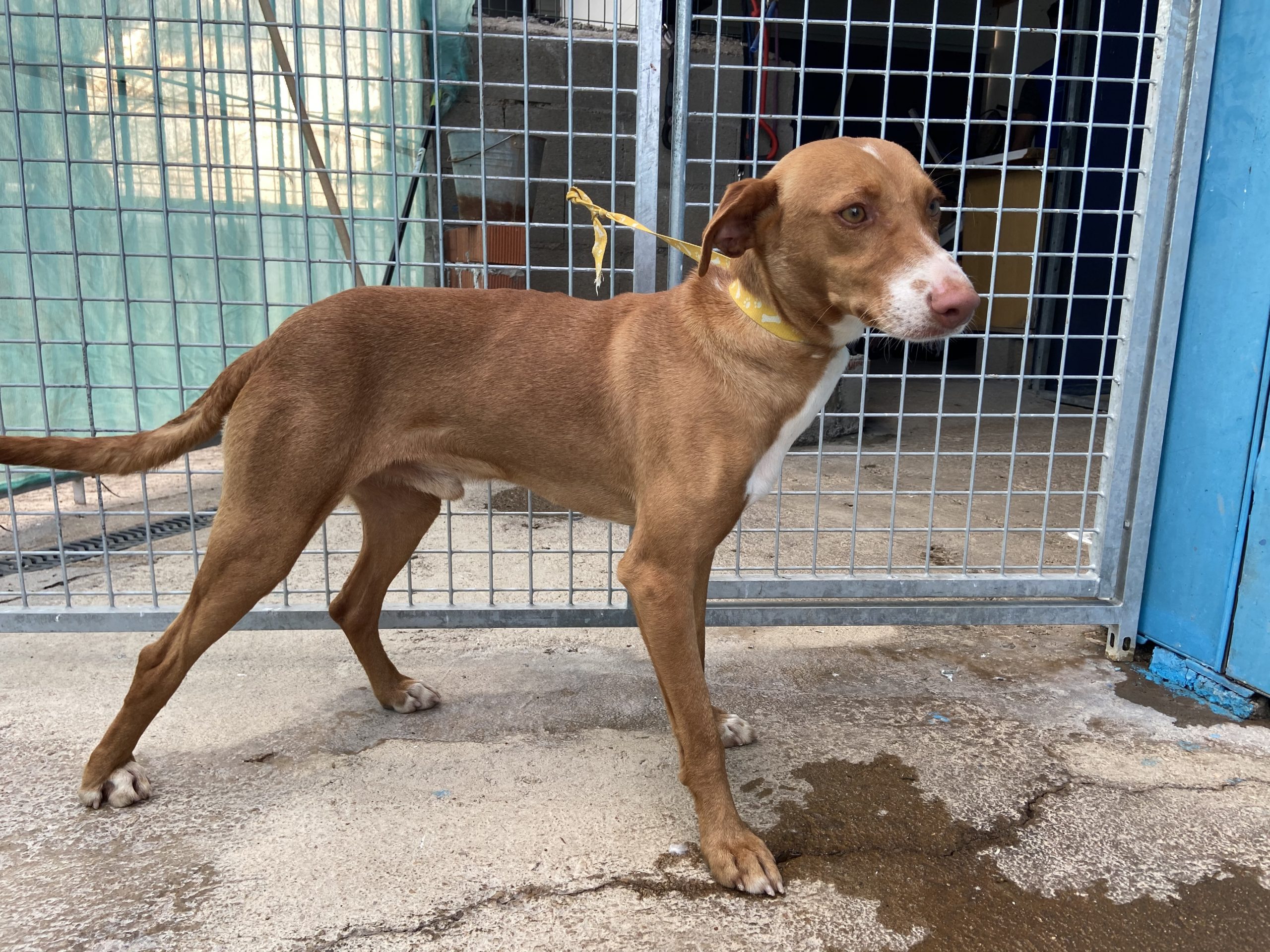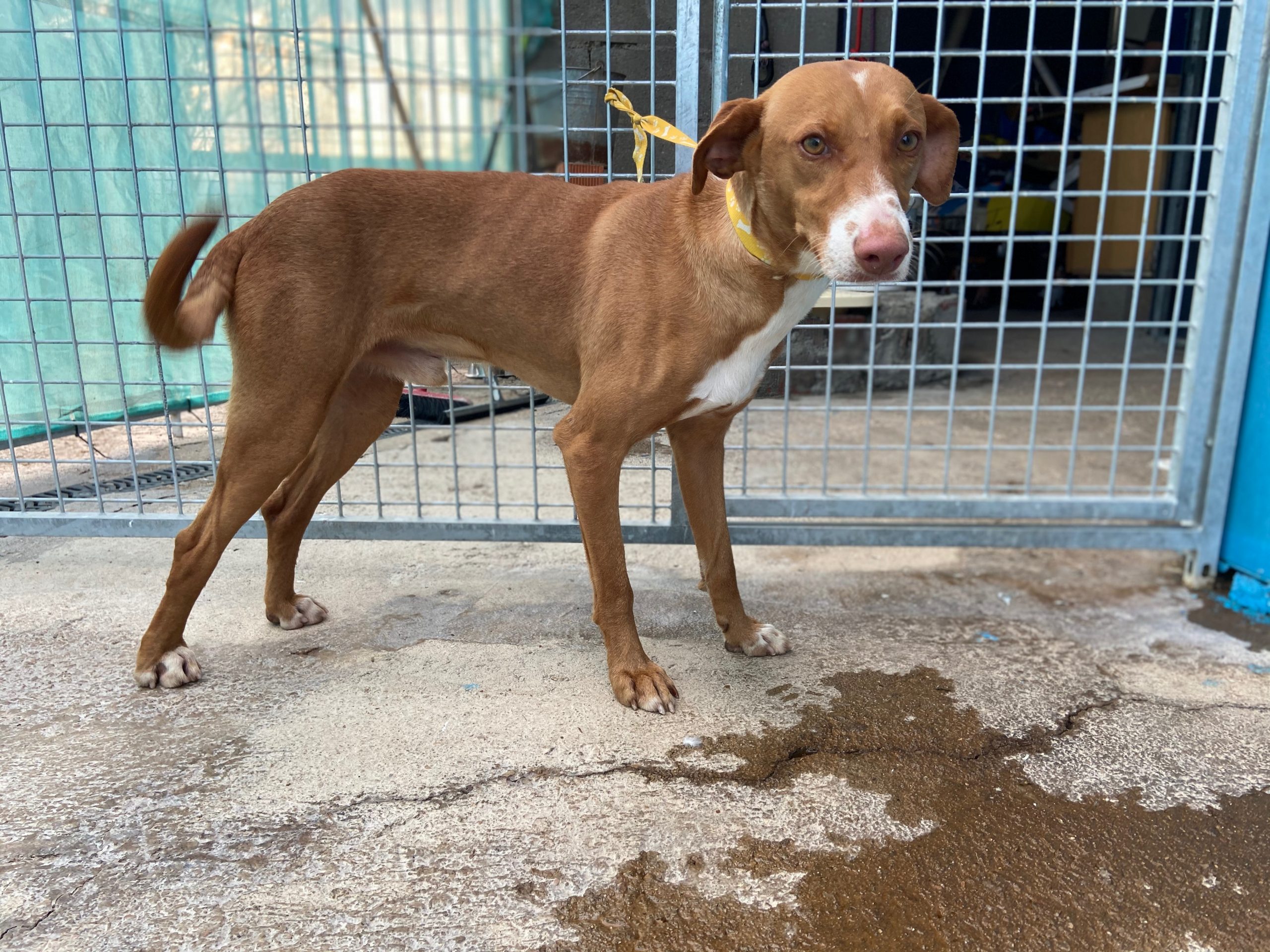 Romero es un podenco muy bueno y jovencito que andaba solo por el paseo.