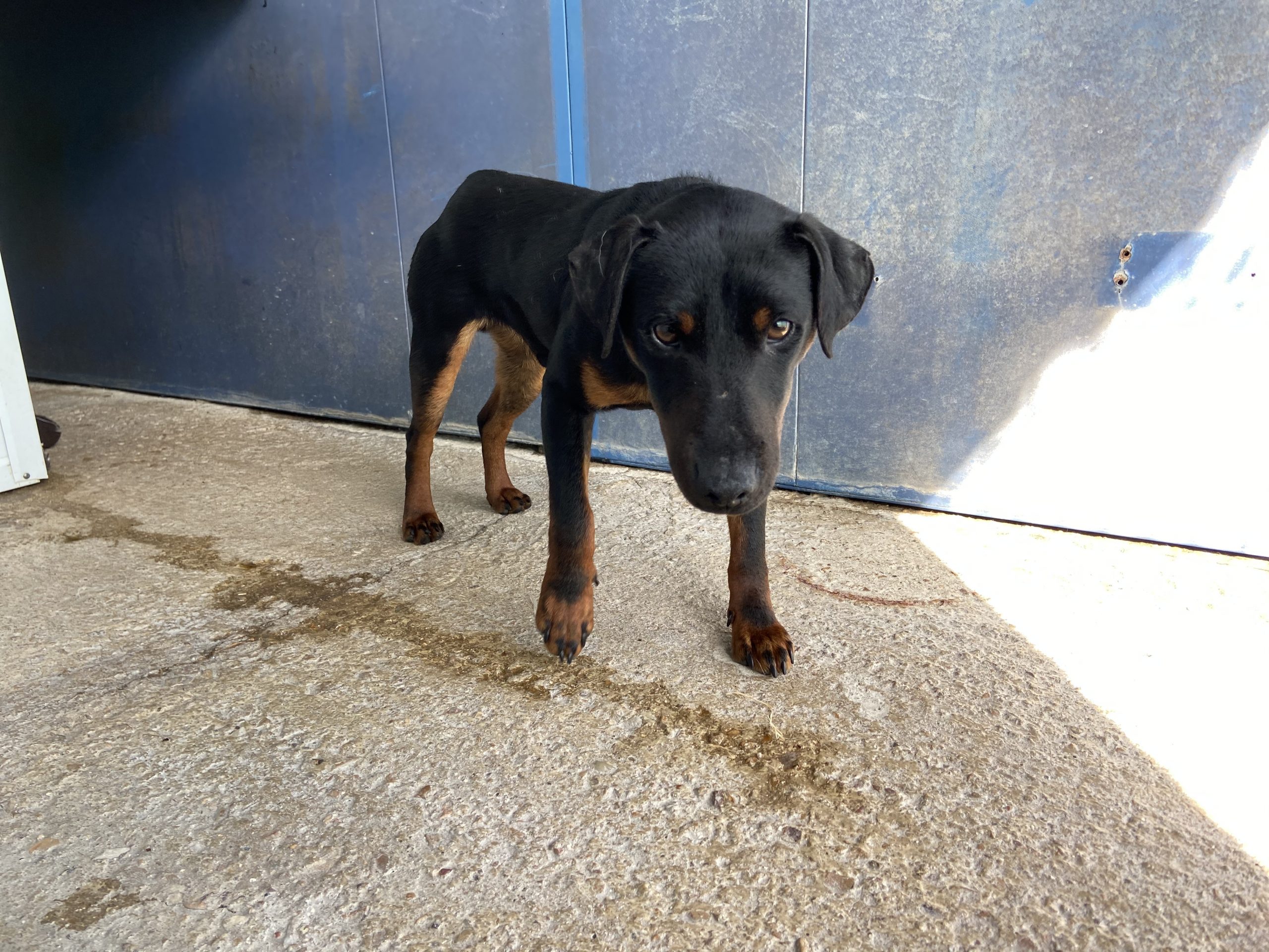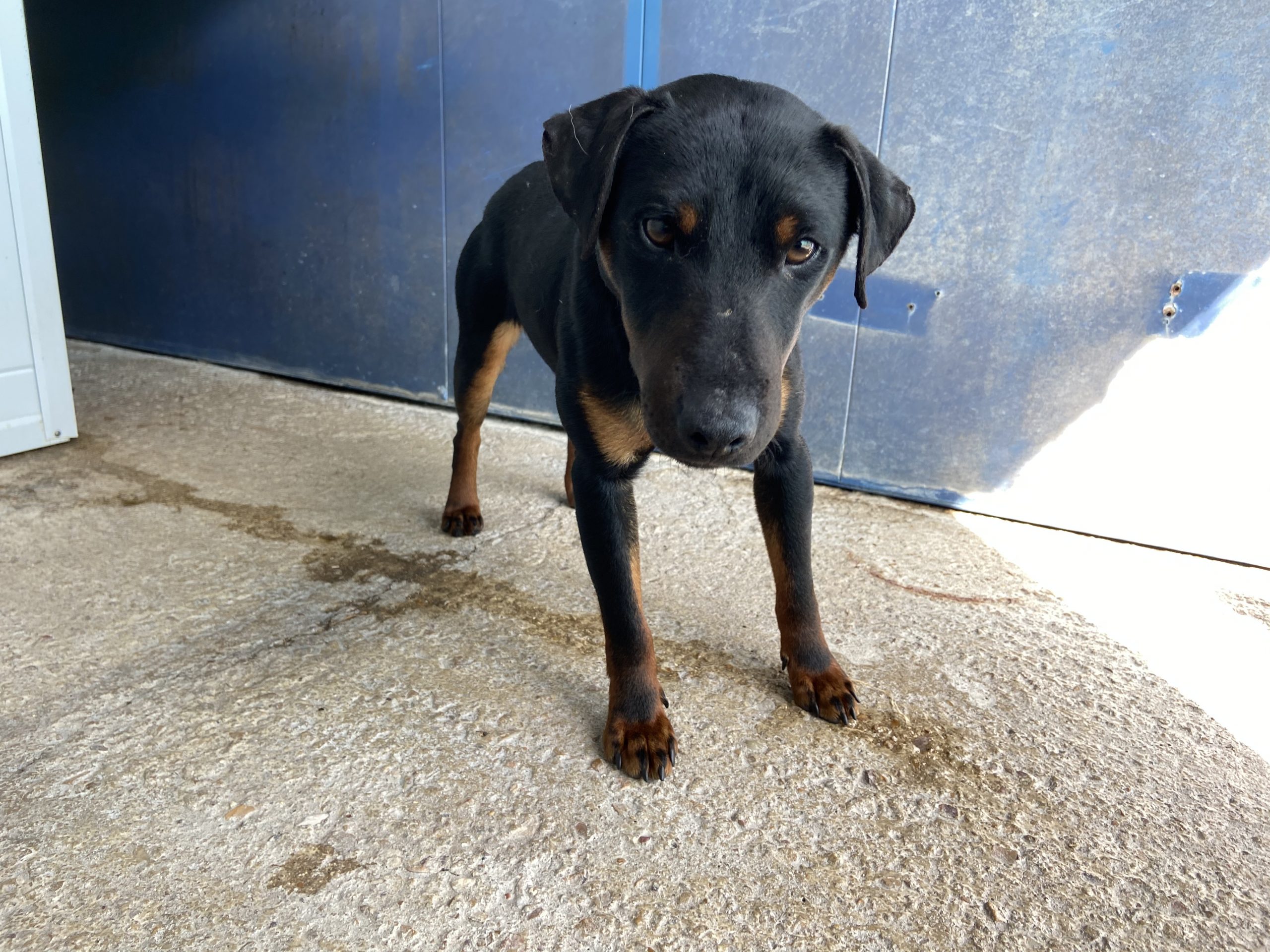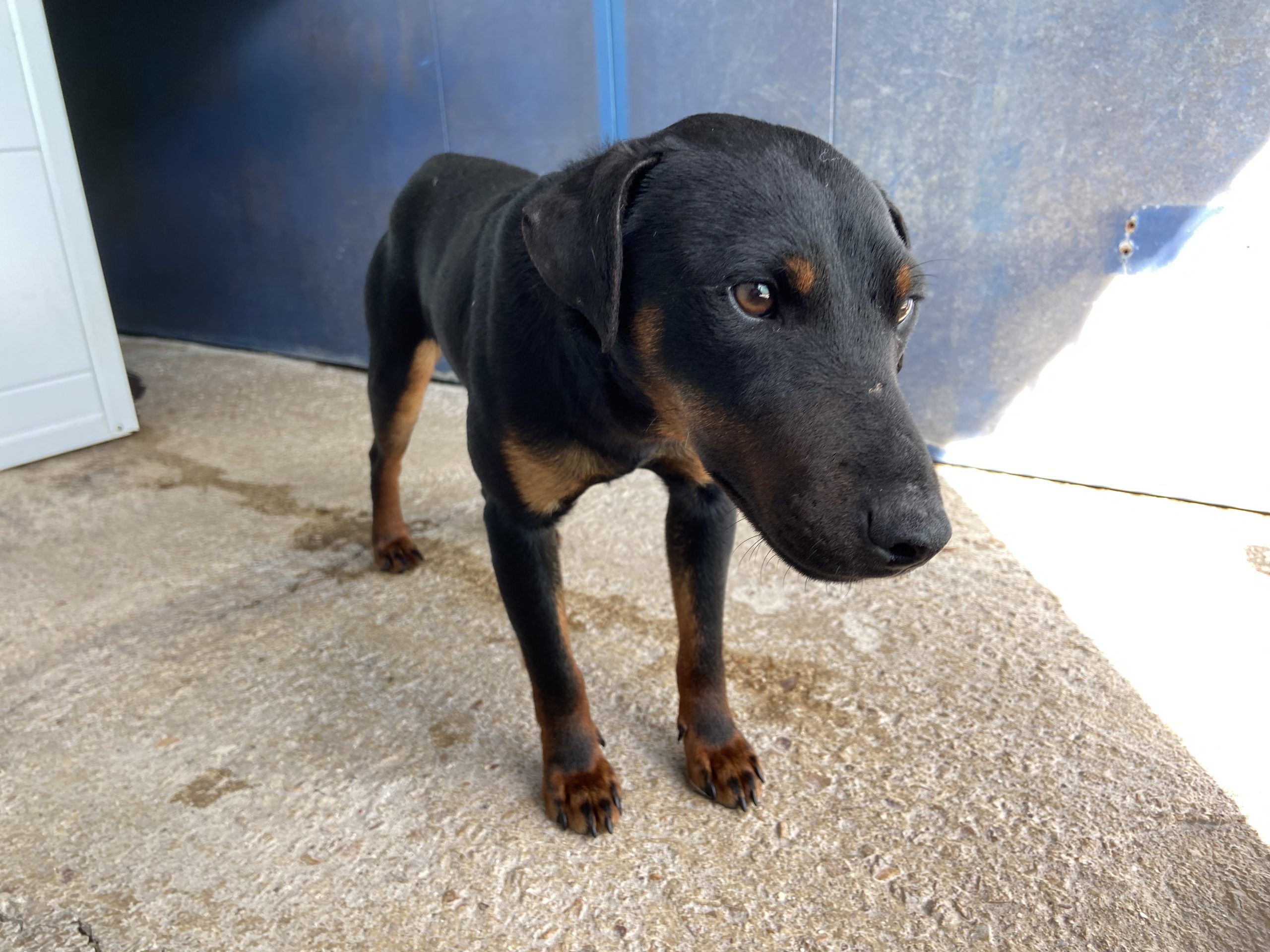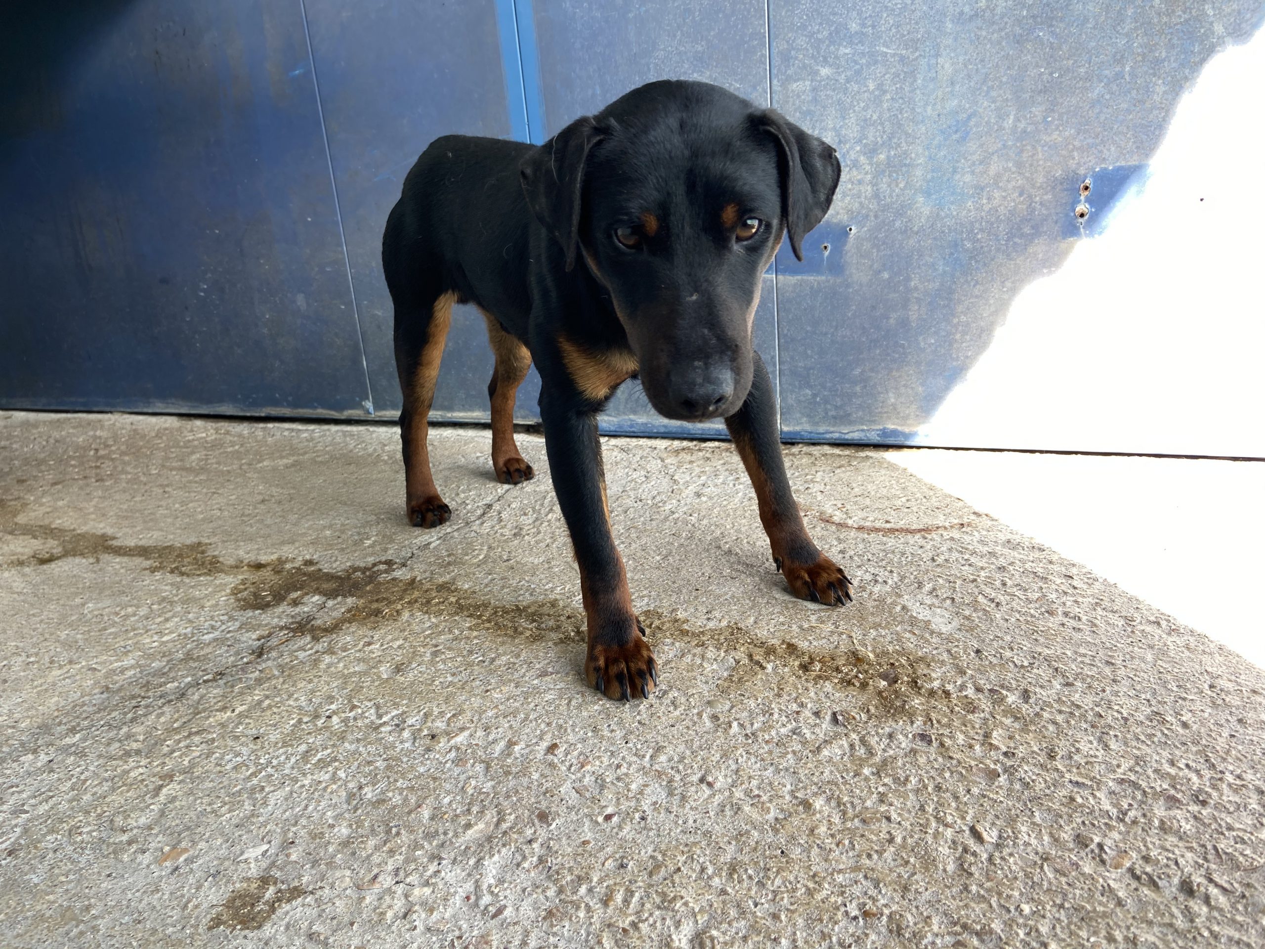 Está bastante asustado, tiembla un poco cuando te acercas, pero pasados unos minutos y le acaricias es un perro muy dulce, tranquilo , bueno, es un auténtico amor.