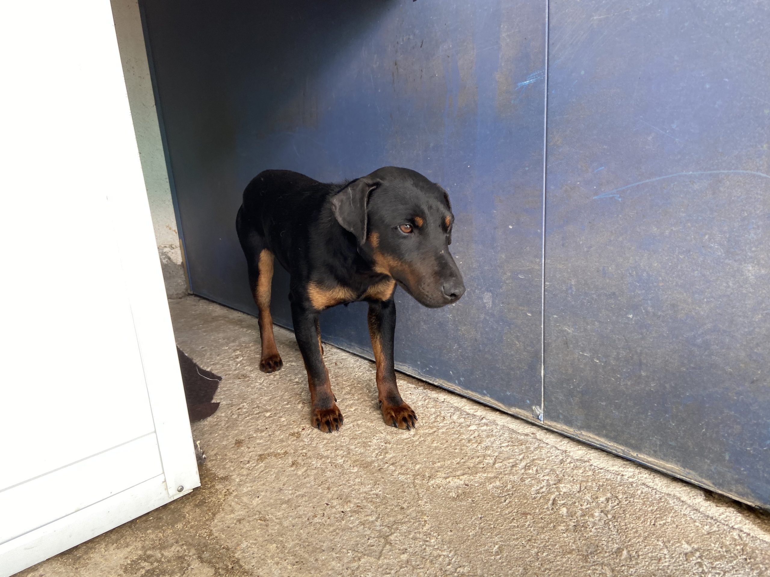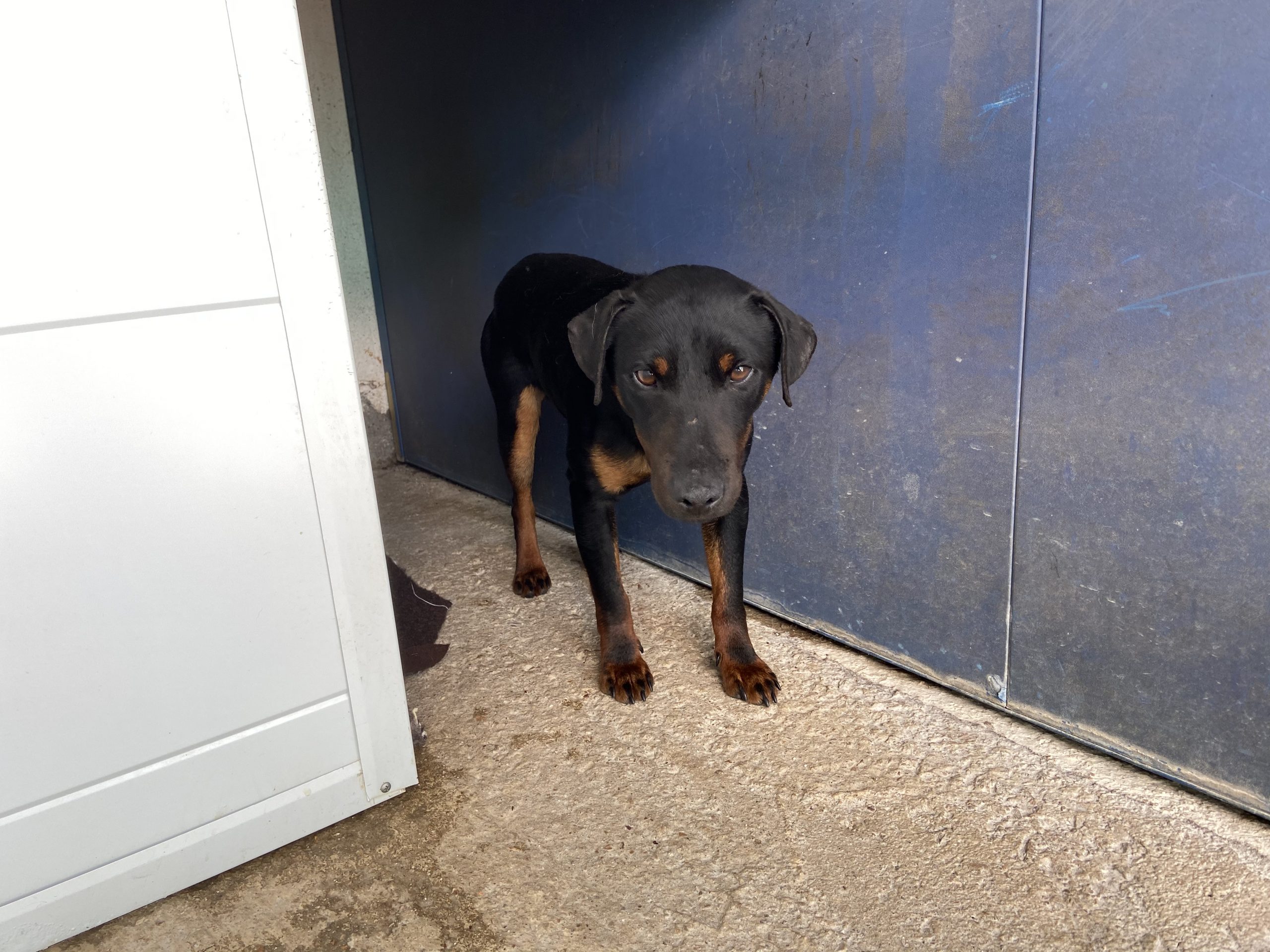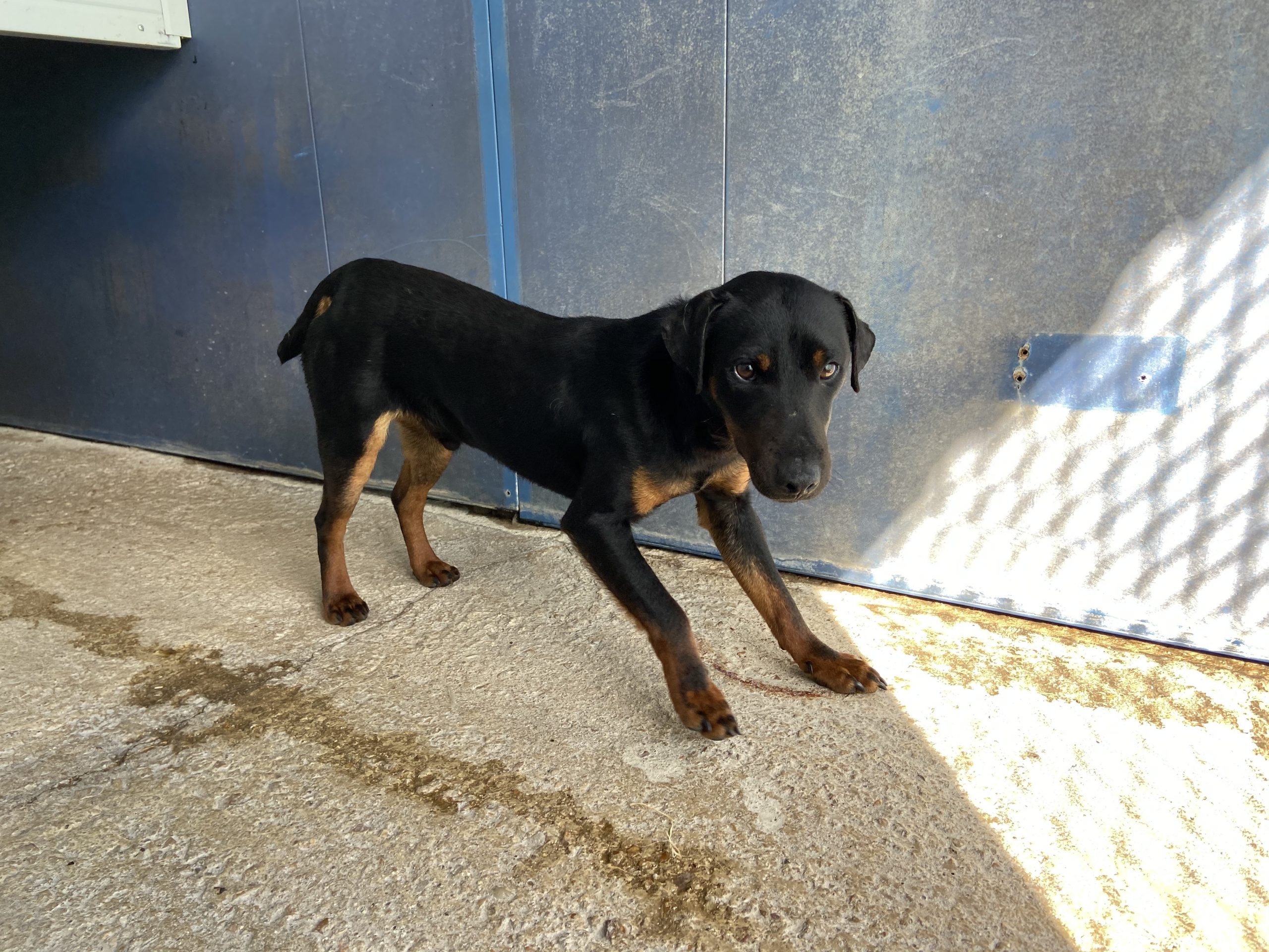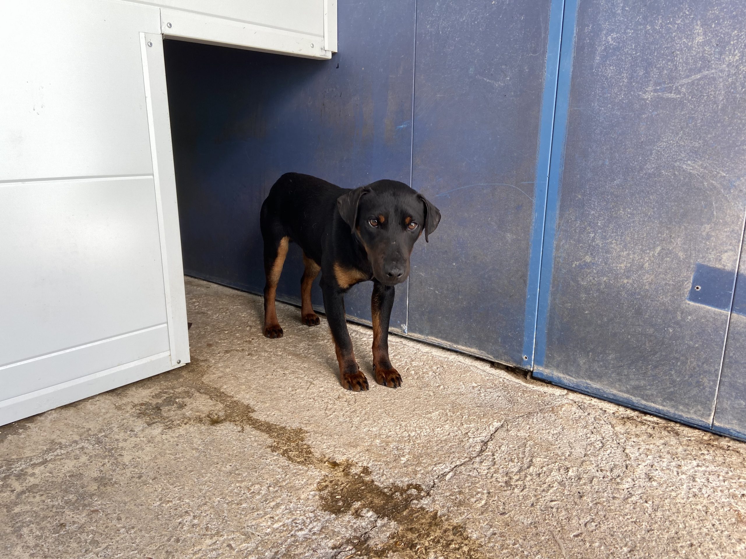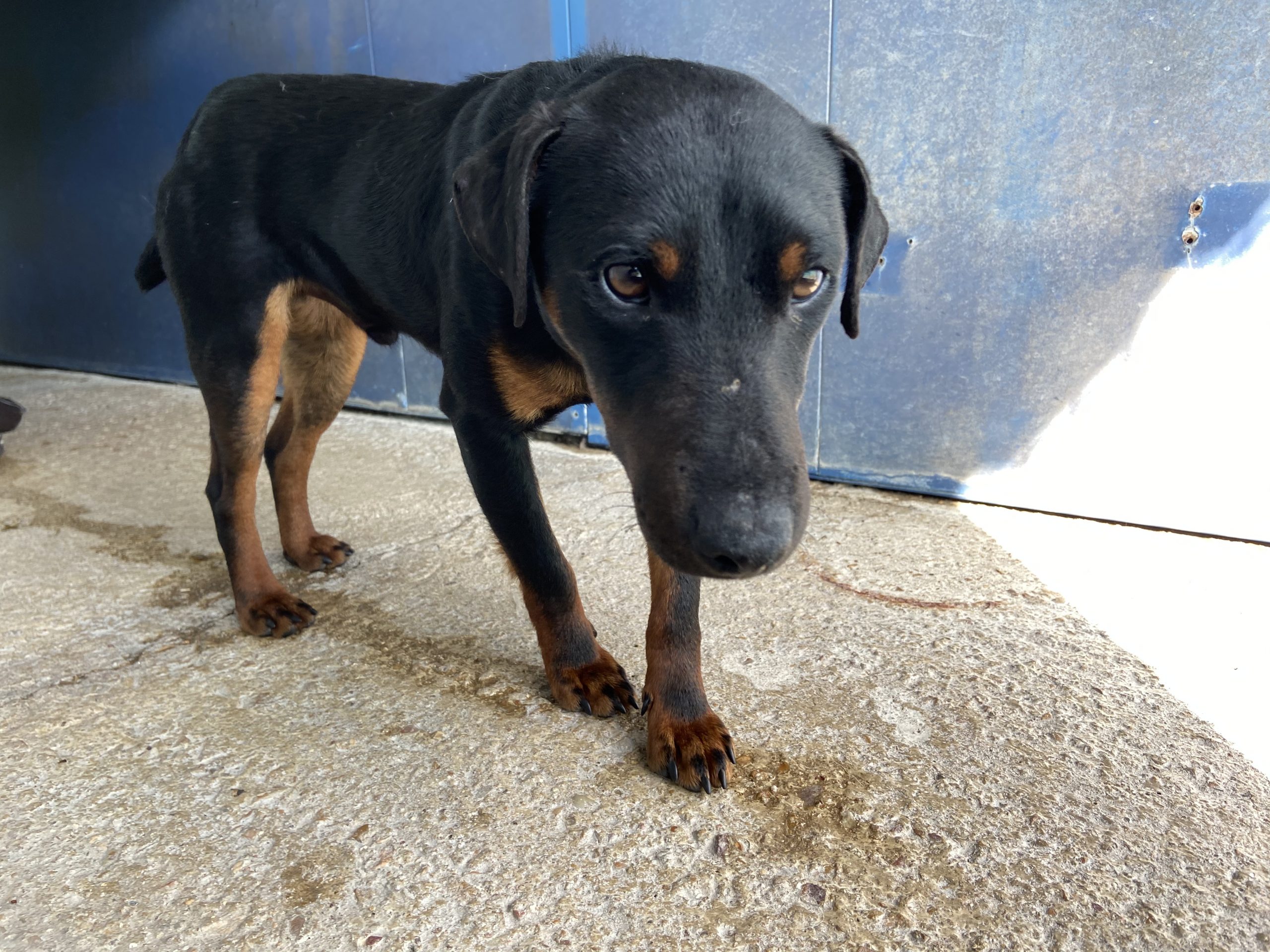Está bastante asustado, tiembla un poco cuando te acercas, pero pasados unos minutos y le acaricias es un perro muy dulce, tranquilo , bueno, es un auténtico amor.