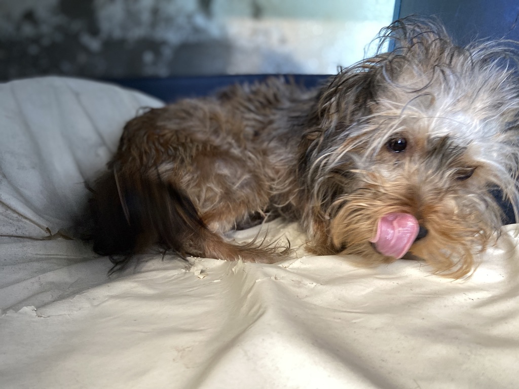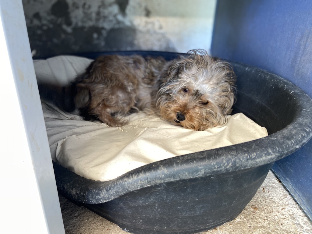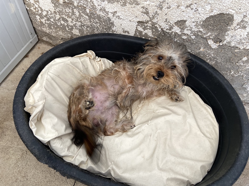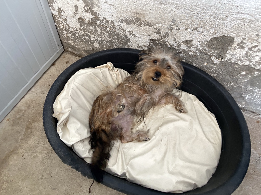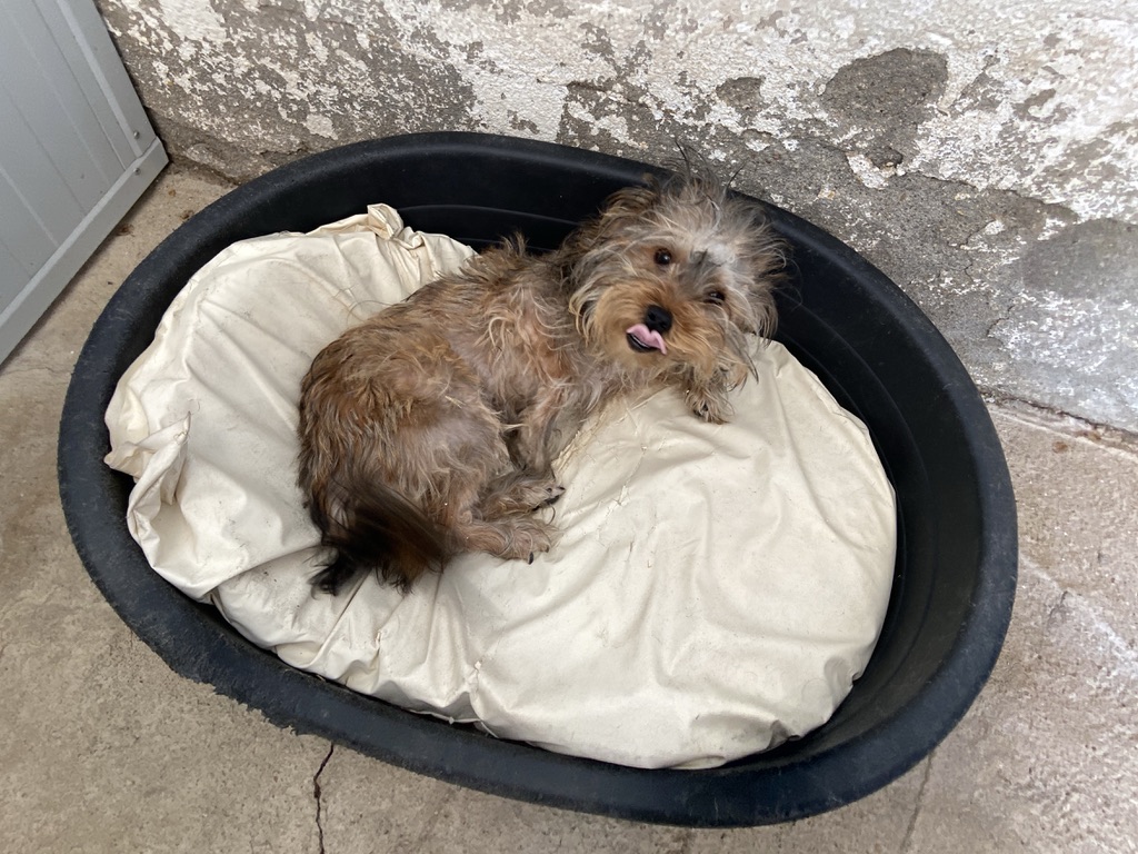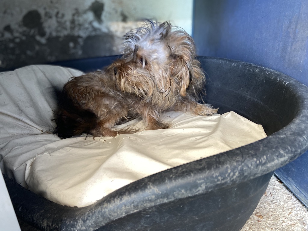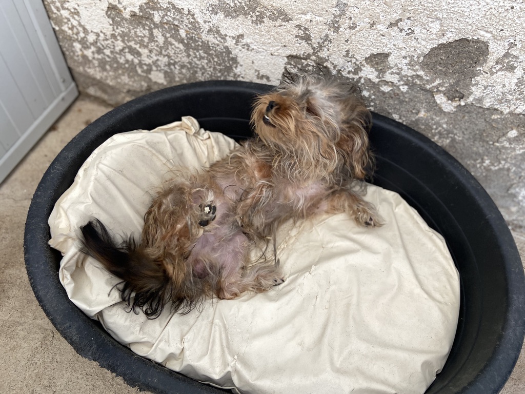 Rhuss es un perrito muy pequeño y joven que estaba vagando por las afueras de Puertollano, estaba totalmente lleno de pinchos. Se los hemos quitado y lavado.