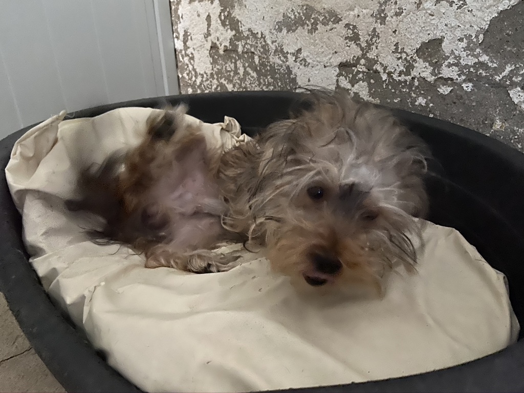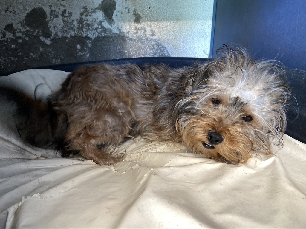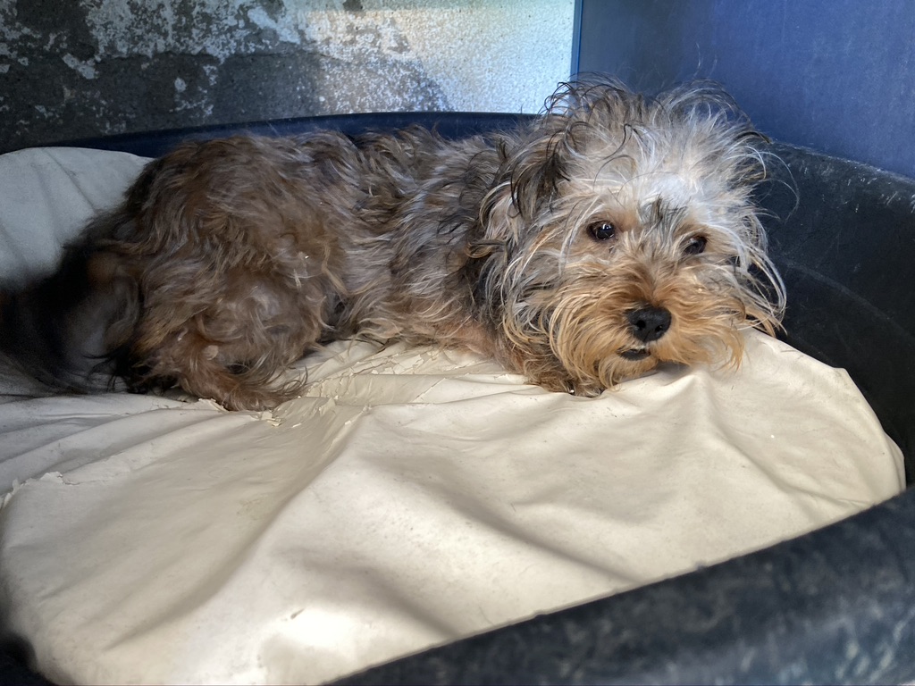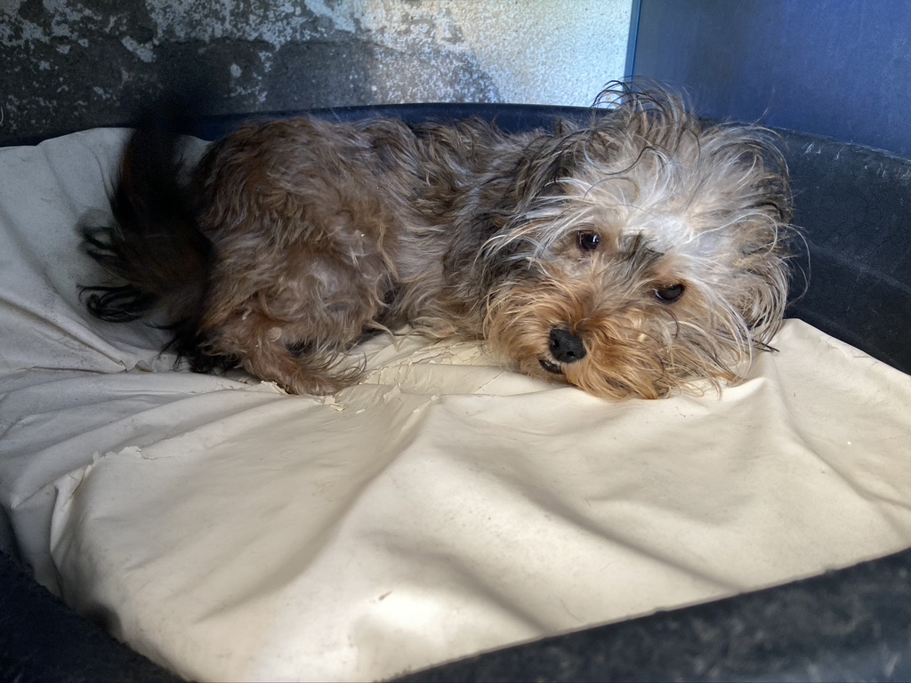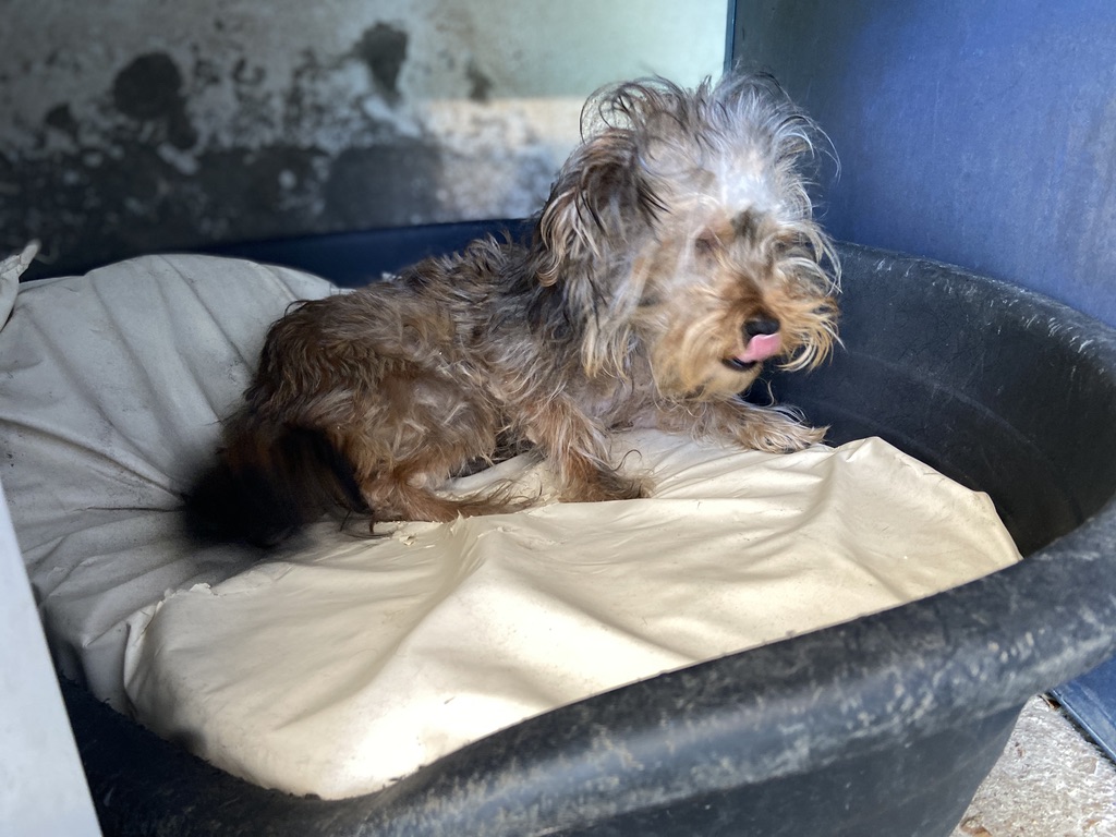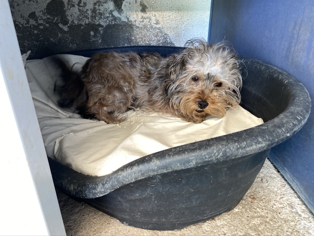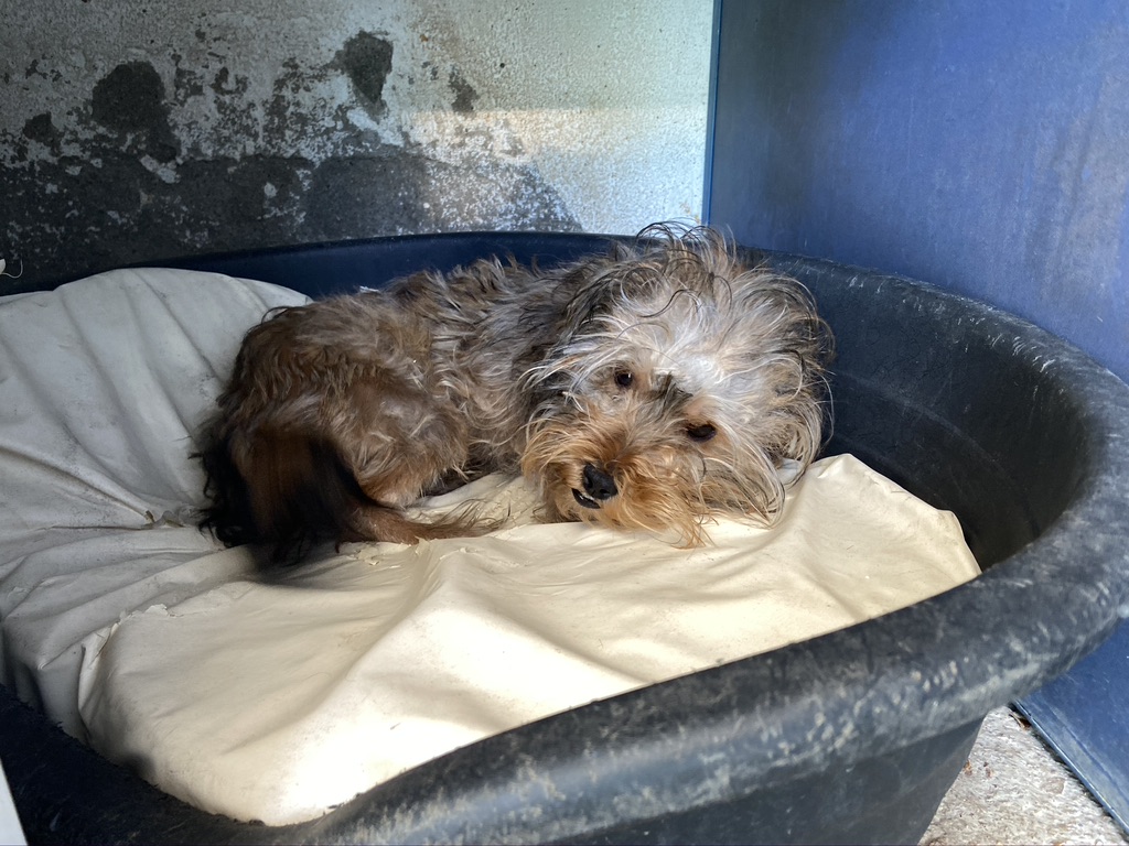 Rhuss es un perrito muy pequeño y joven que estaba vagando por las afueras de Puertollano, estaba totalmente lleno de pinchos. Se los hemos quitado y lavado.