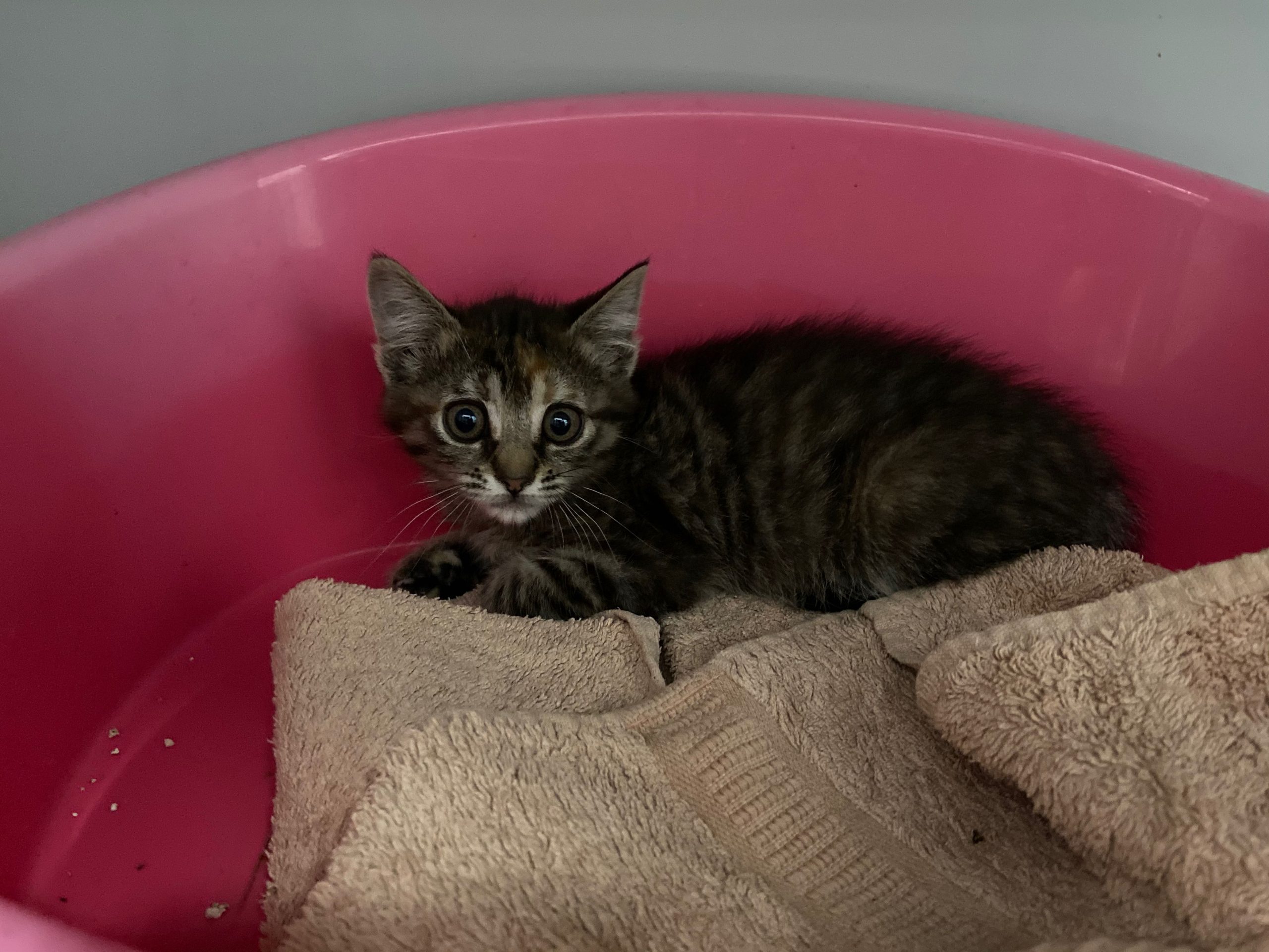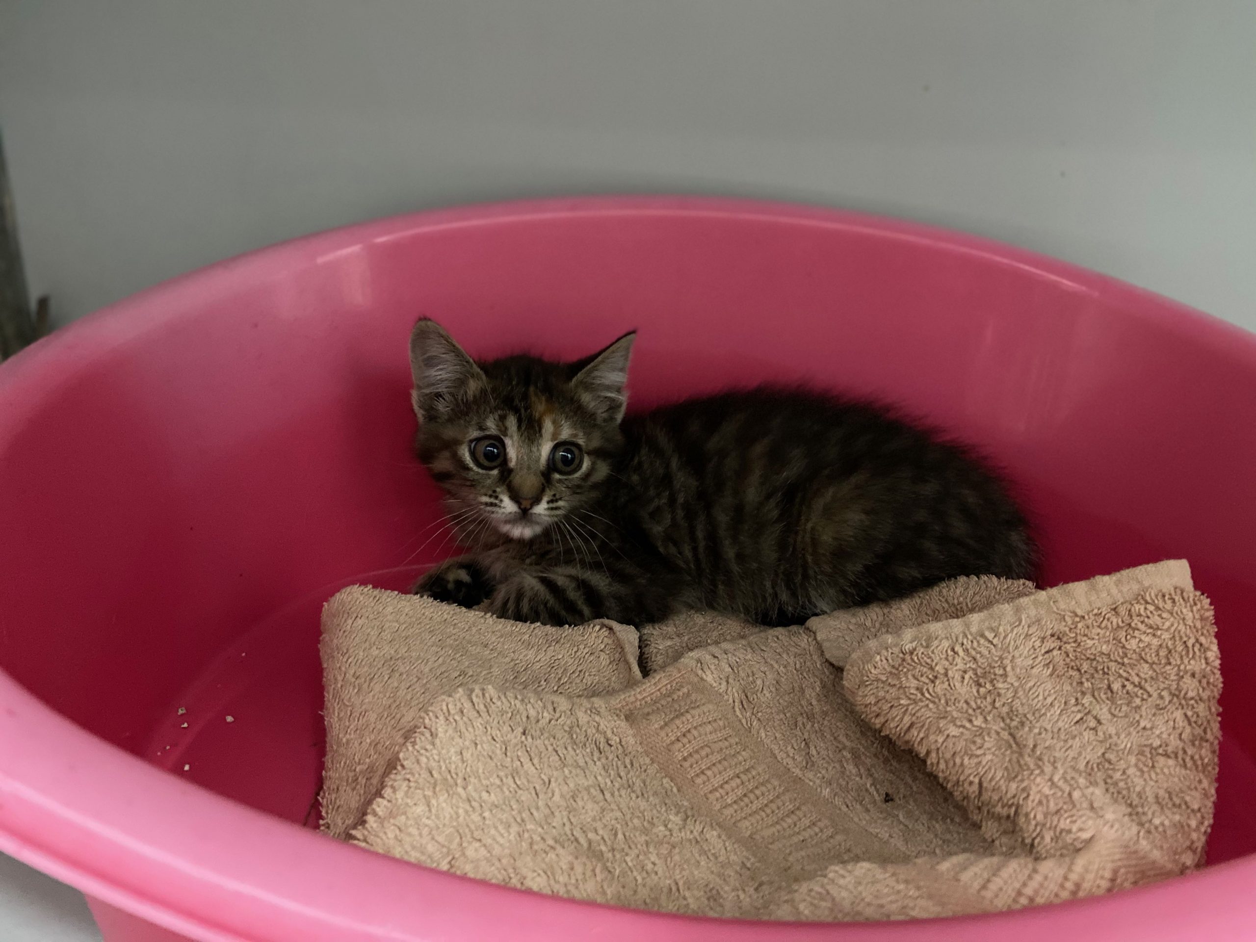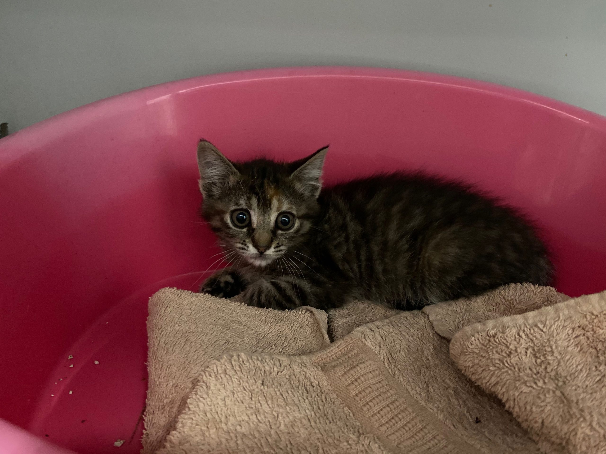 Llego muy asustada, ahora sigue un poquito, pero le encanta la tengas en brazos.