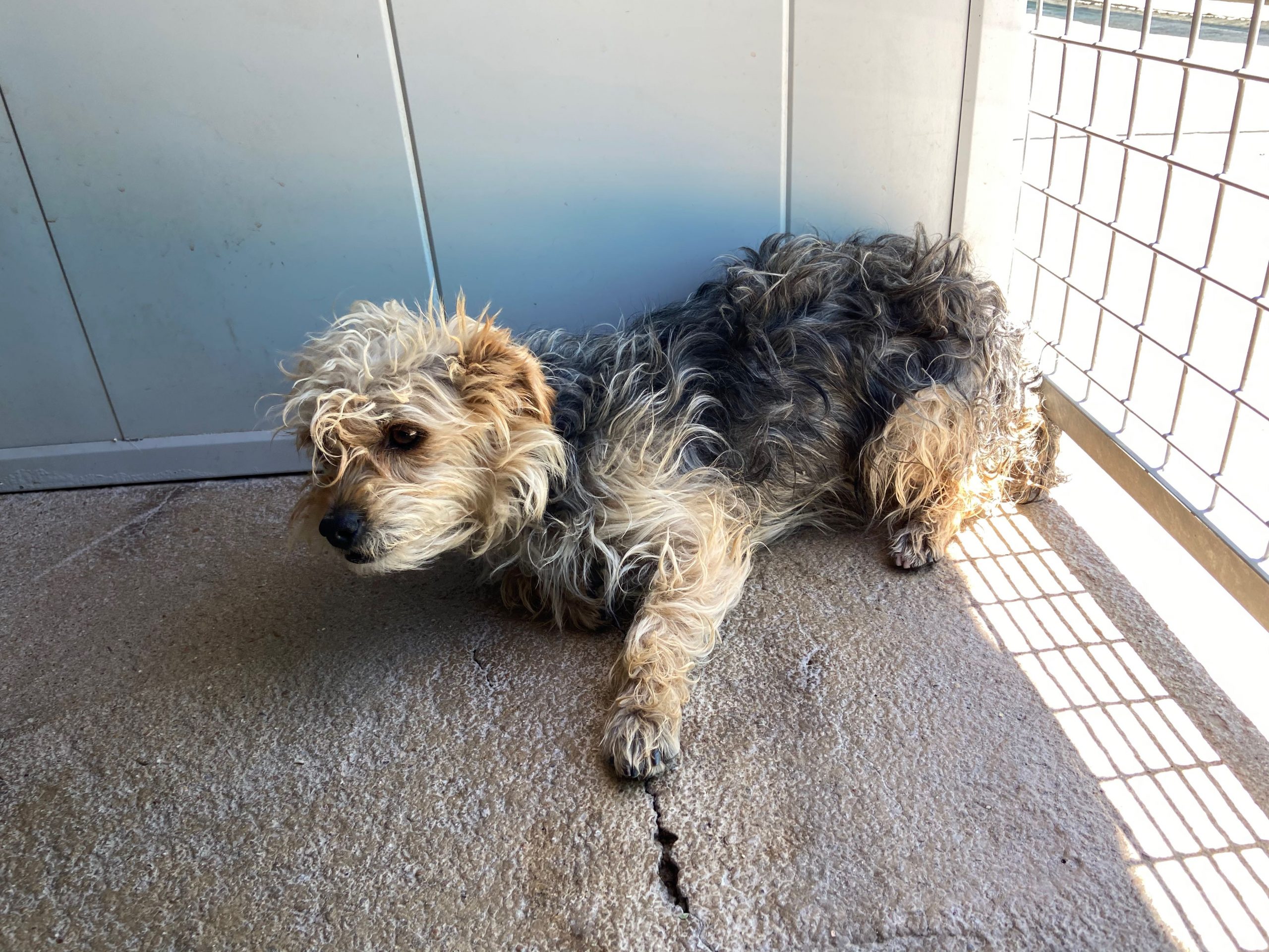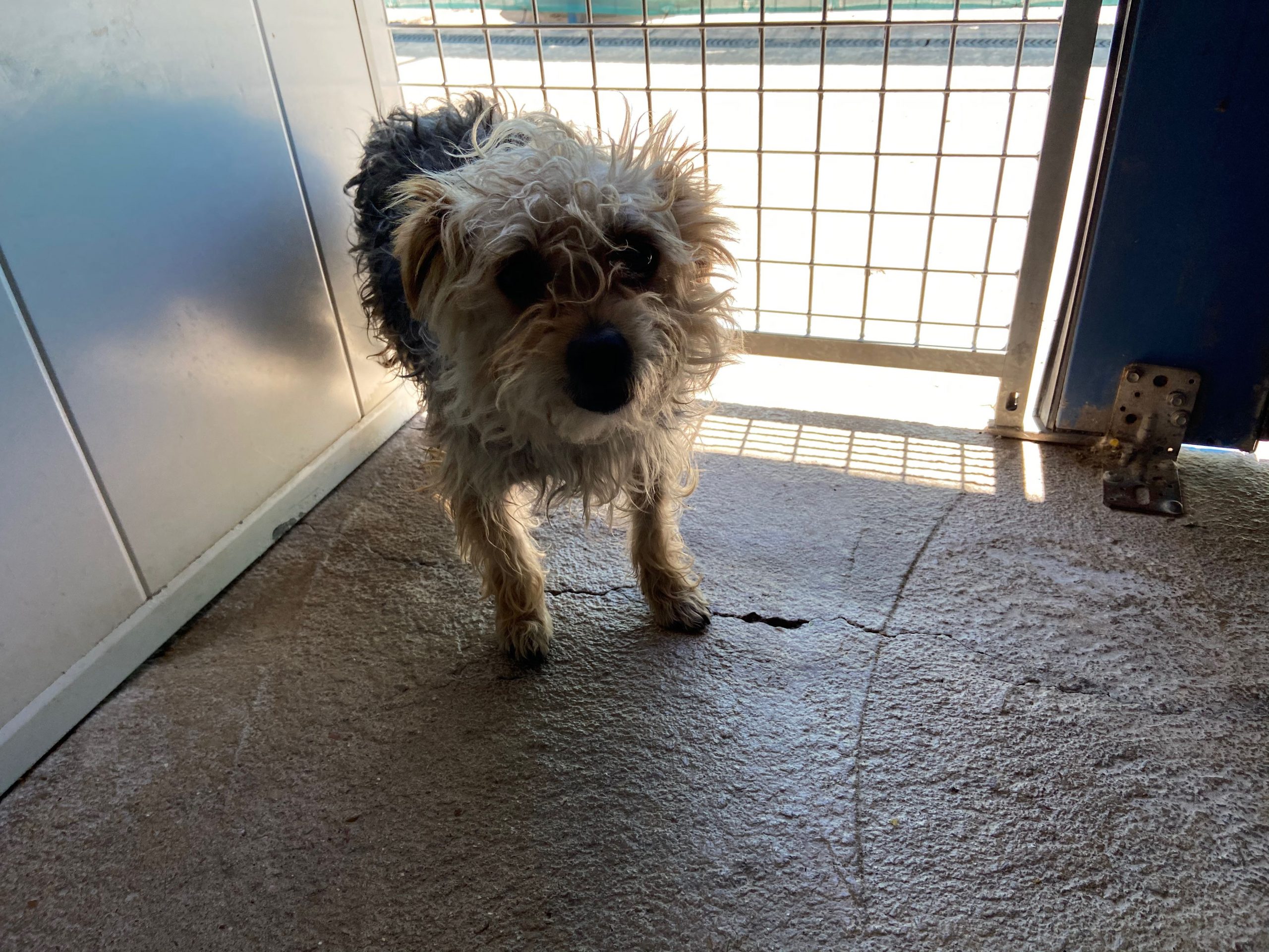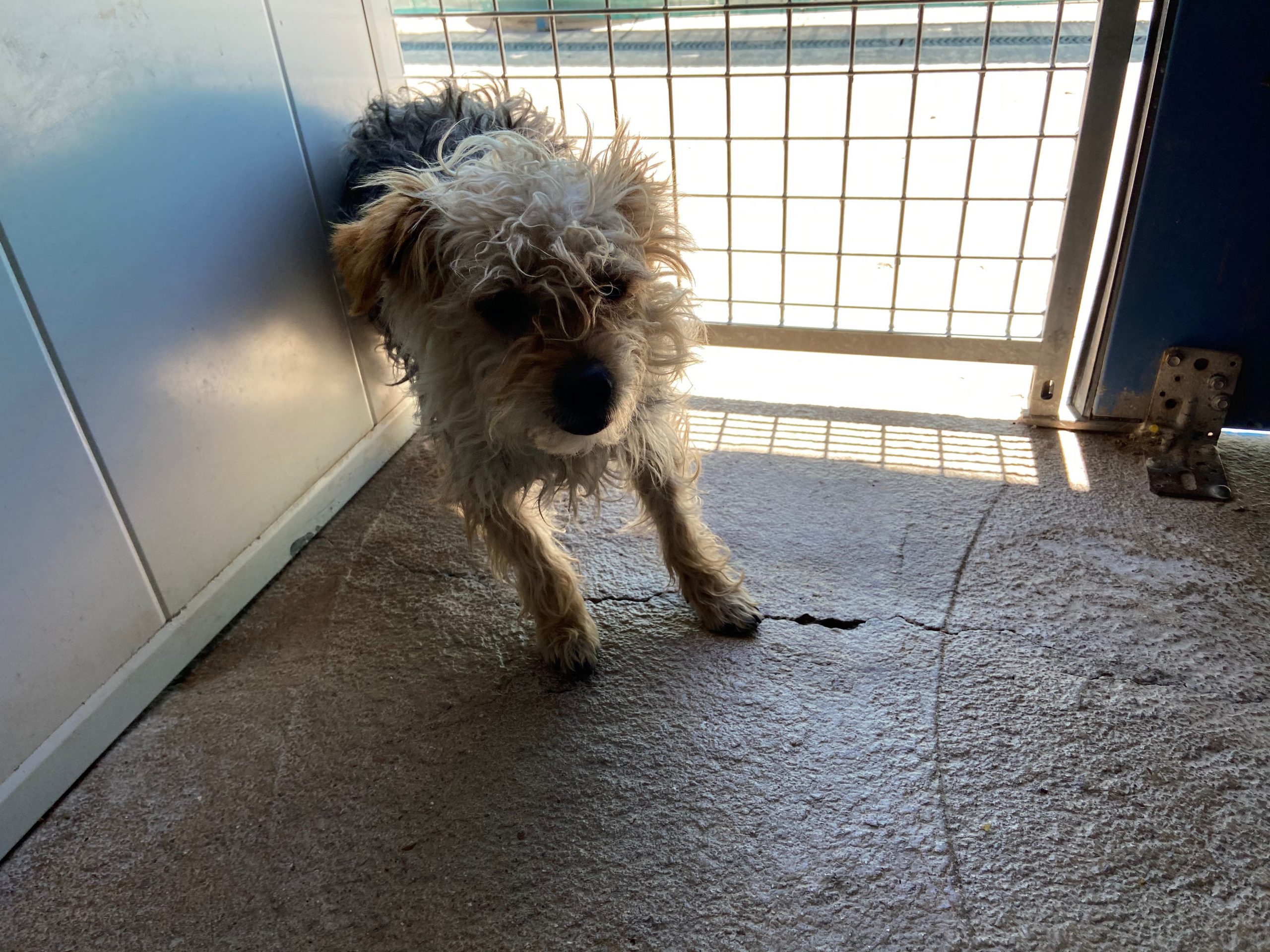 Está muy mal cuidado , tiene todo el pelo enredado y lleno de pinchos y además cada vez que intentamos tocarlo tiene miedo y se agacha, tiene todo el aspecto de que le pegaban.