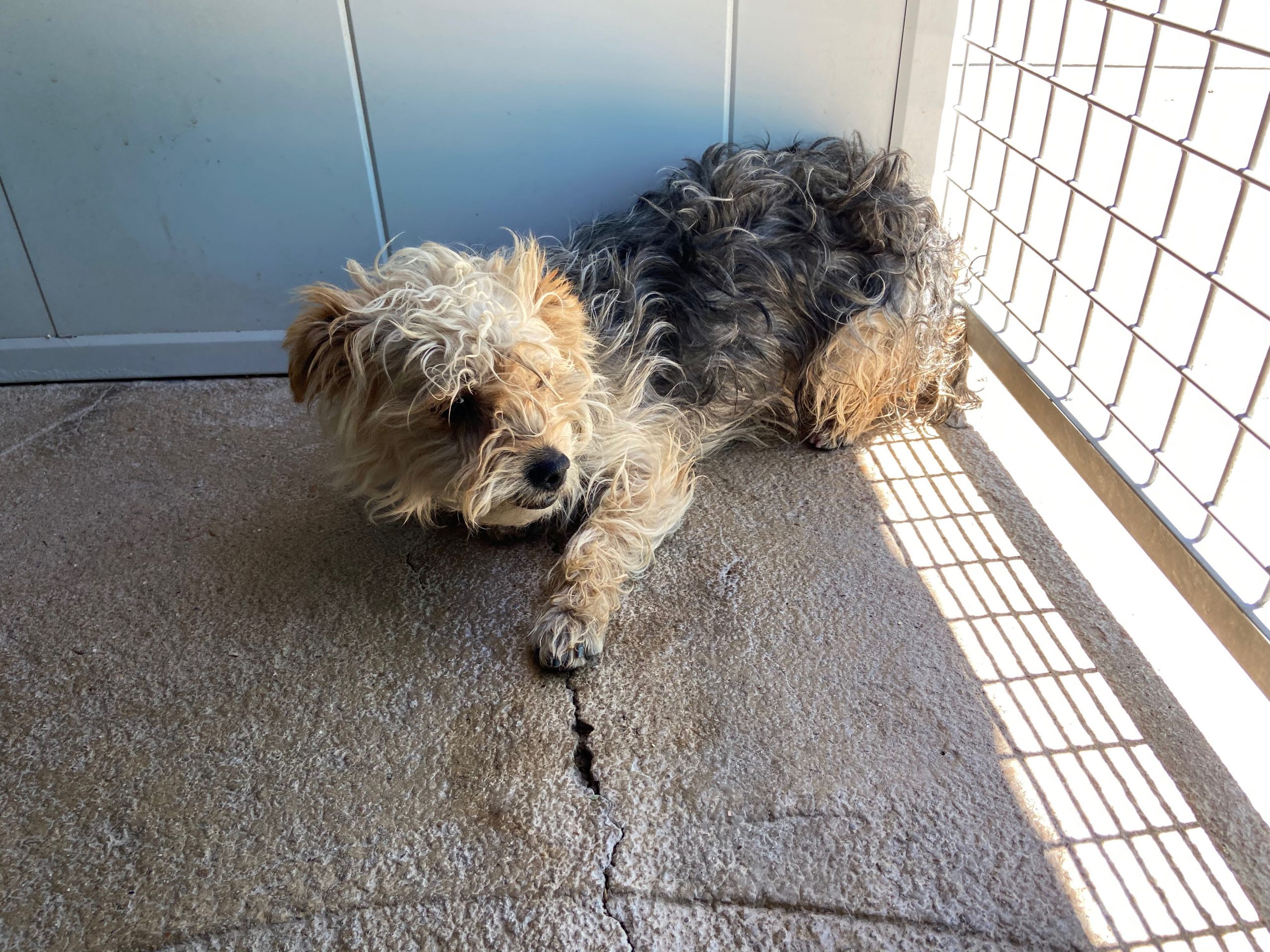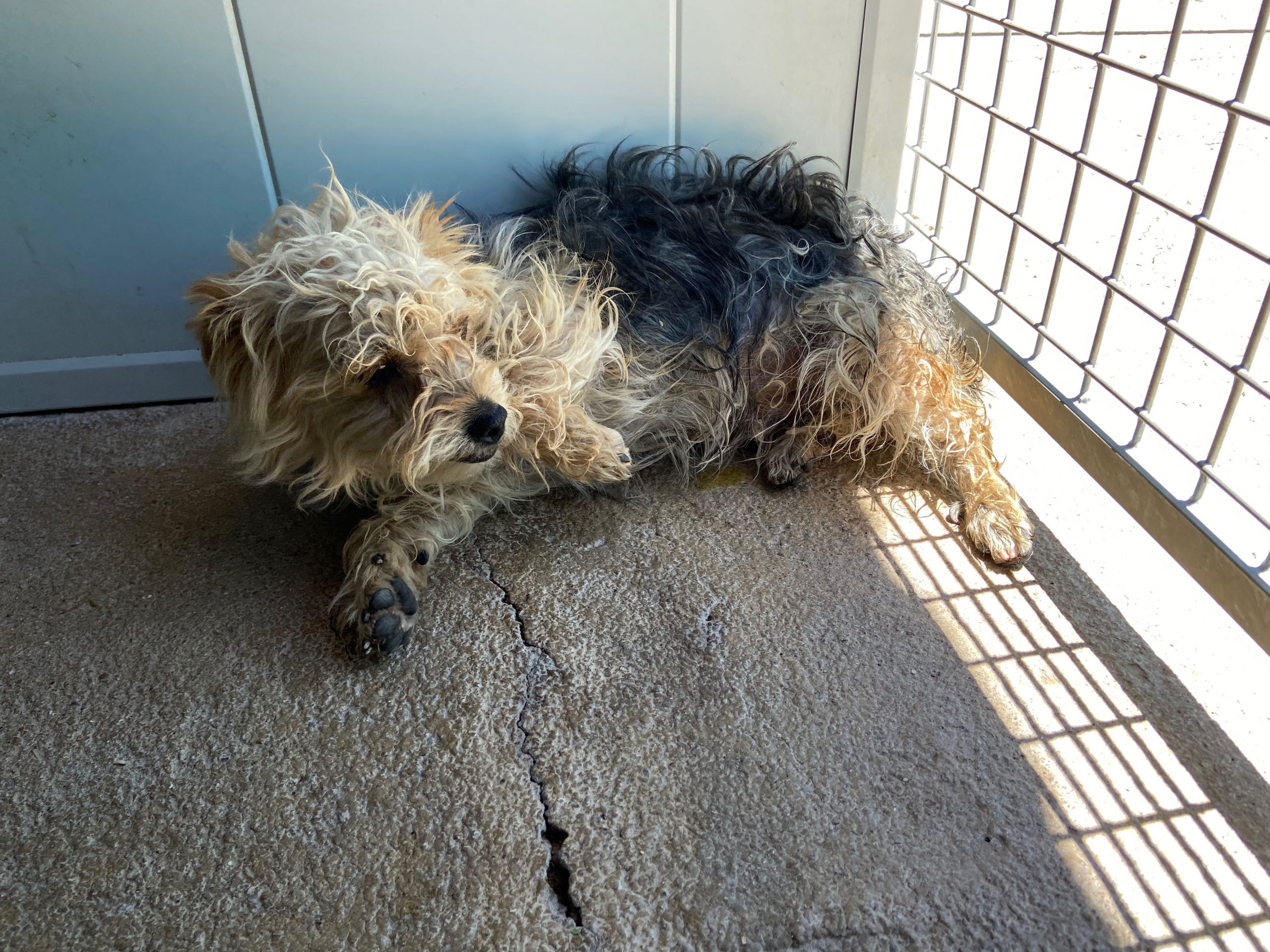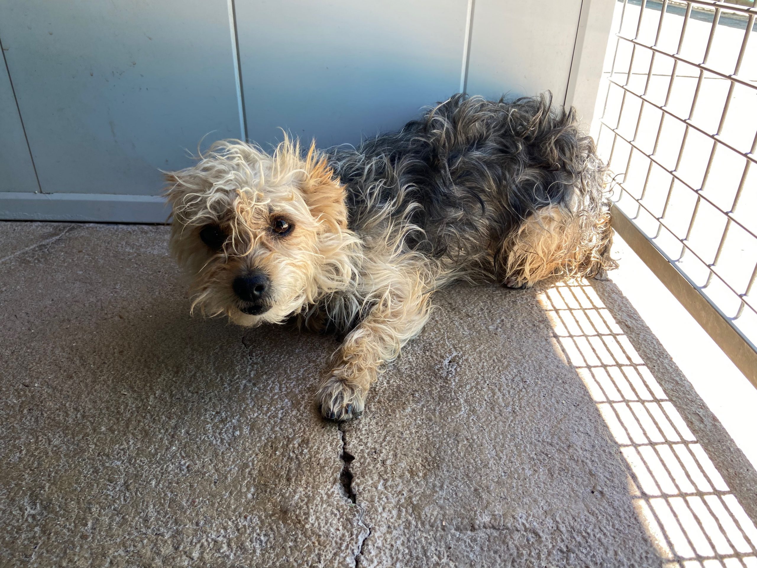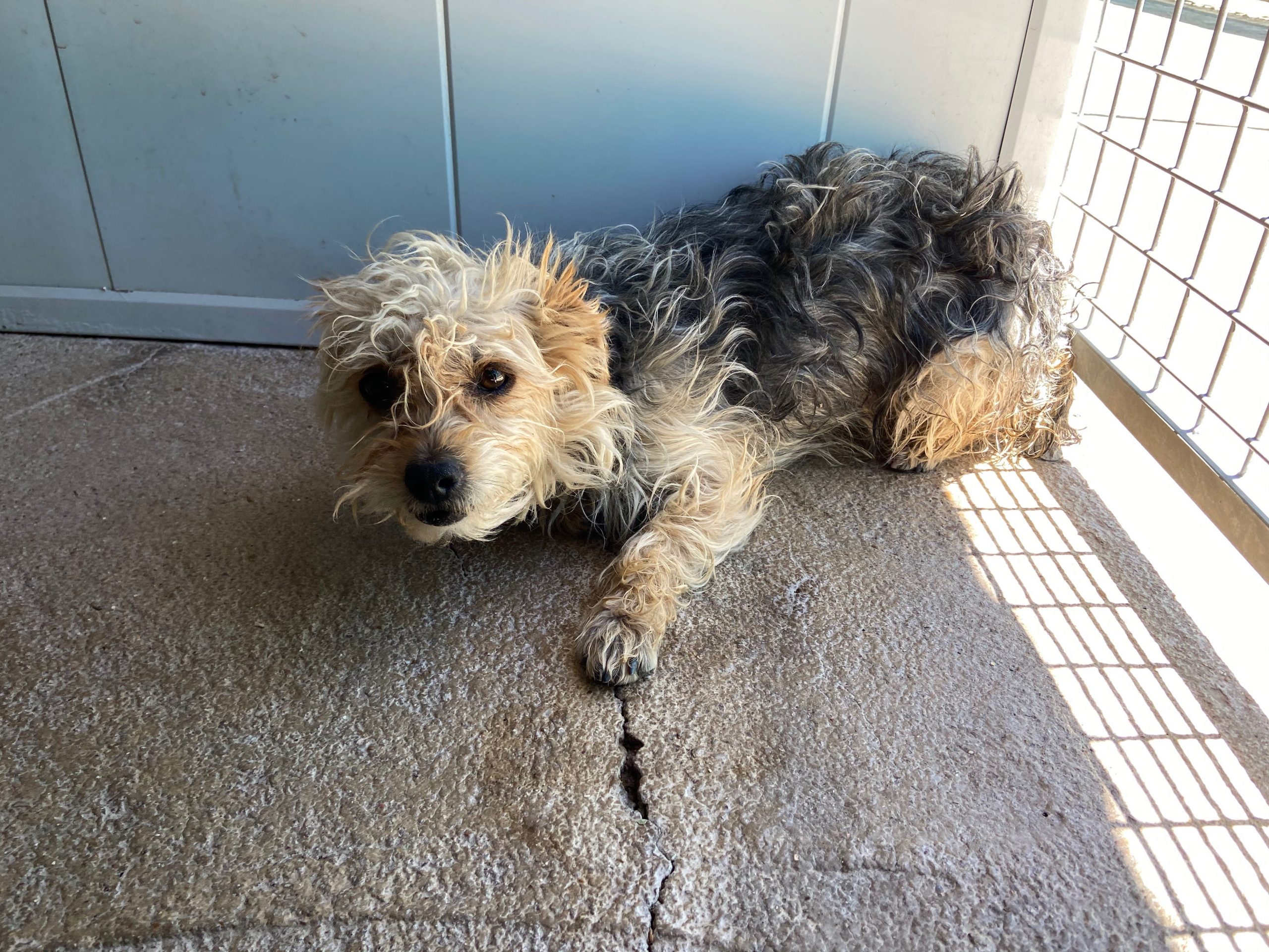 Está muy mal cuidado , tiene todo el pelo enredado y lleno de pinchos y además cada vez que intentamos tocarlo tiene miedo y se agacha, tiene todo el aspecto de que le pegaban.
