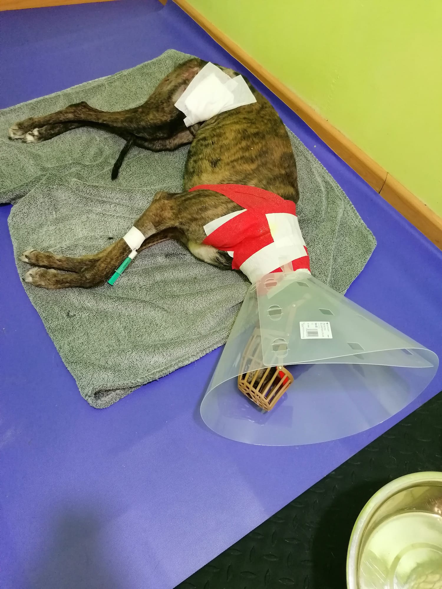 Tras unos días ingresado ahora se encuentra con nosotros, las curas diarias duran más de una hora del estado en el que se encuentra, pero él jamás se queja, es un galgo buenísimo que tras su recuperación le encontraremos una familia que lo quiera y le de un hogar de por vida.