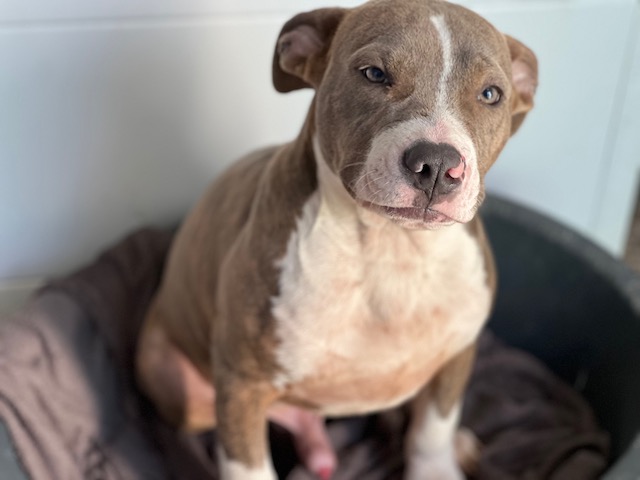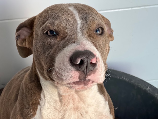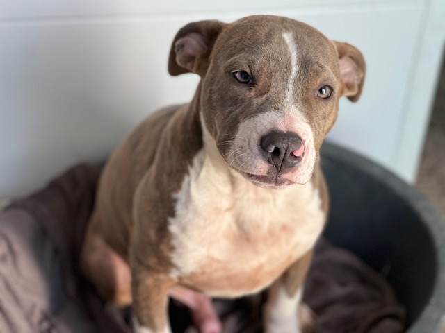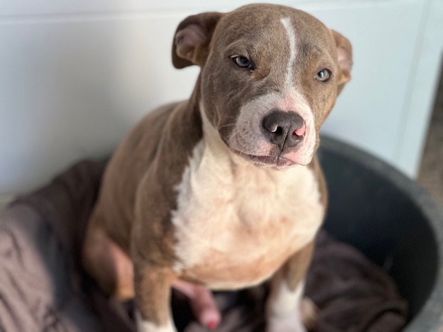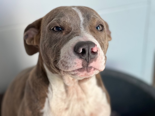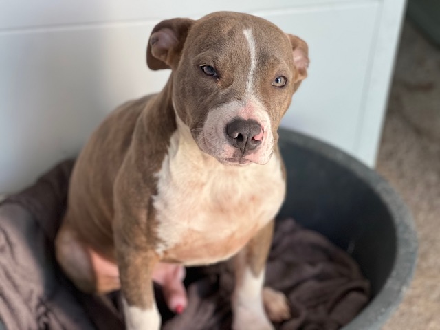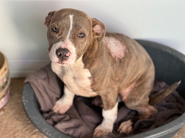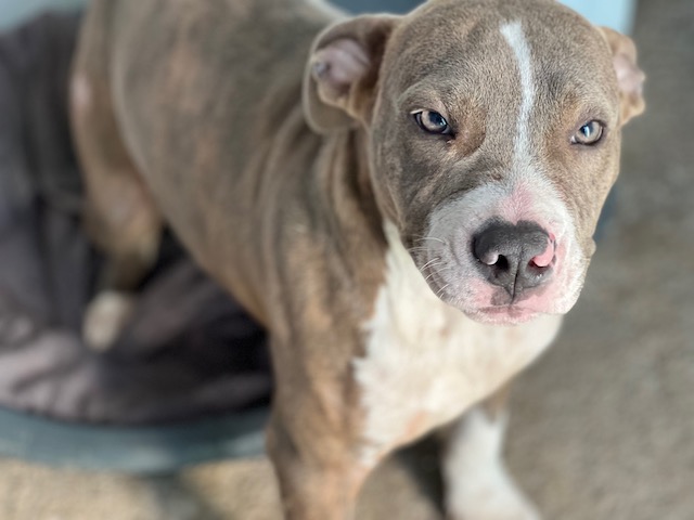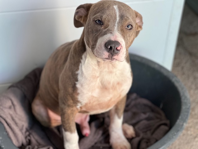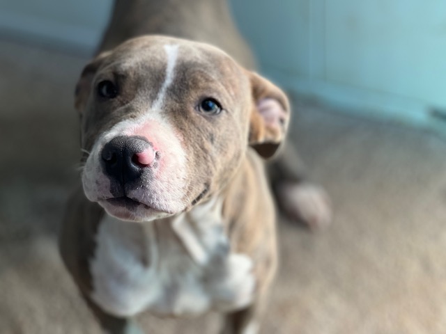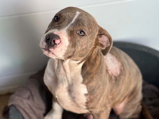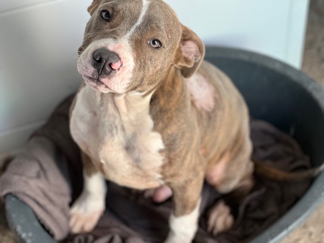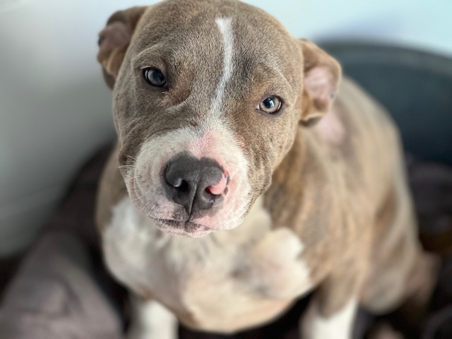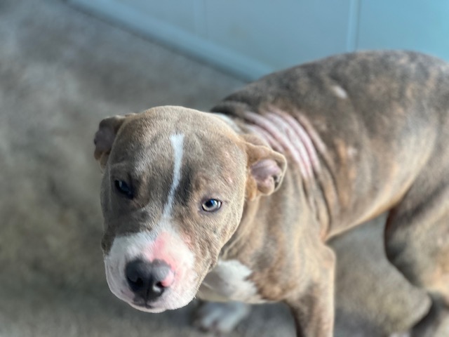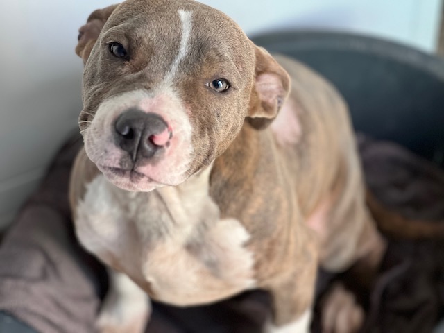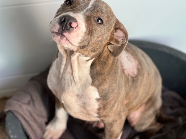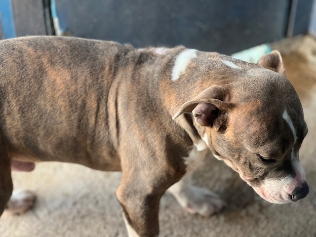 Chester es un cachorrito de american stafford de solo 5 meses aunque en las fotos parece más grande.