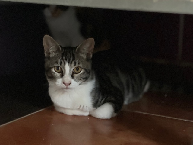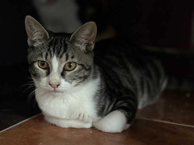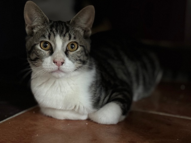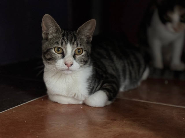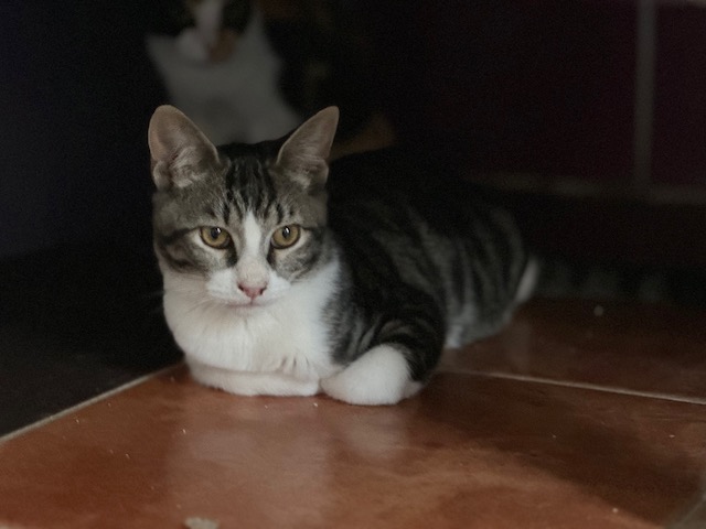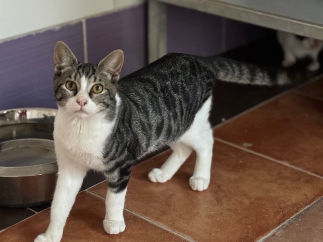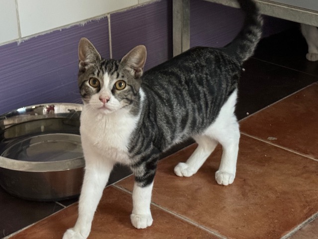 Pomposo parecía tímido al principio cuando llego pero es que estaba aún asustado por su abandono, ahora es un gato super cariñoso y bueno con personas y otros gatos.