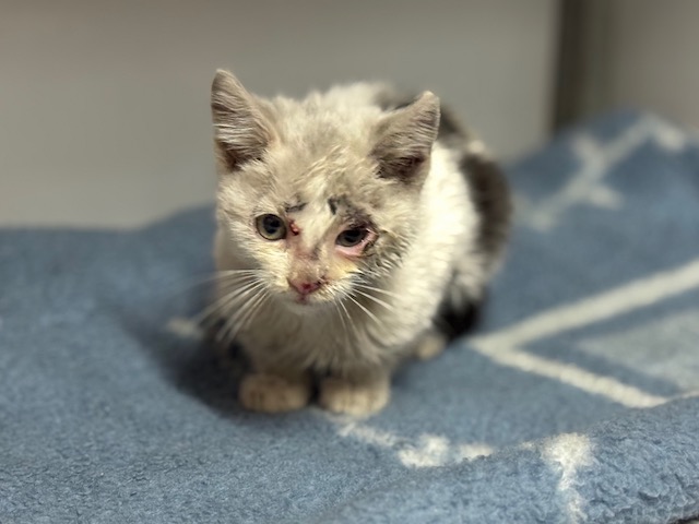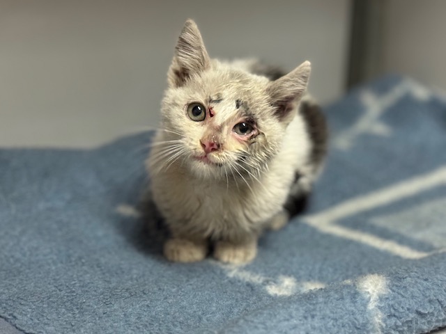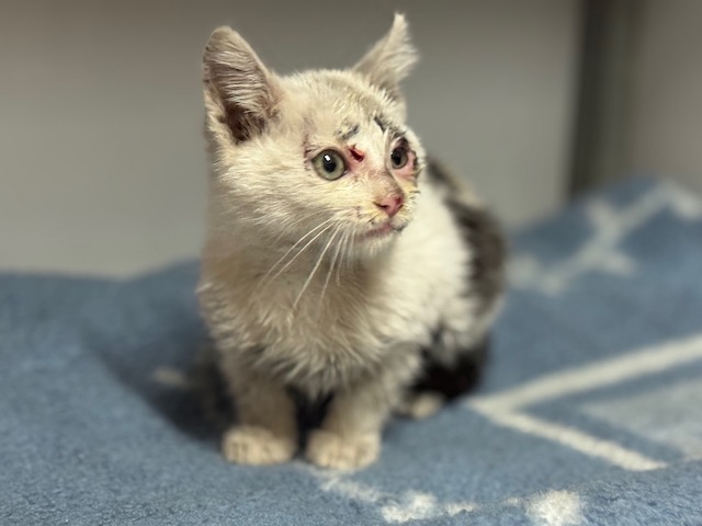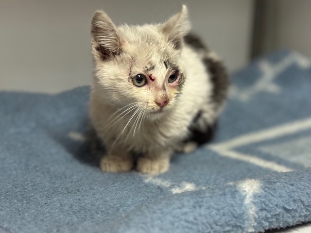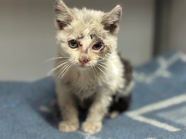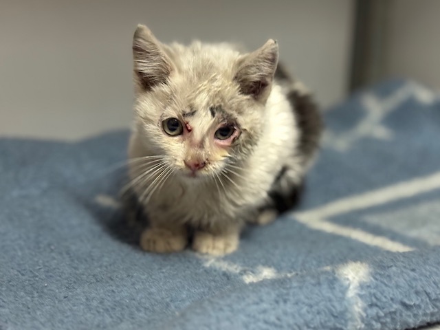 Este precioso gatito ha llegado con conjuntivitis , pulgas y algunas heriditas, en unos días estará perfecto y busca una familia.