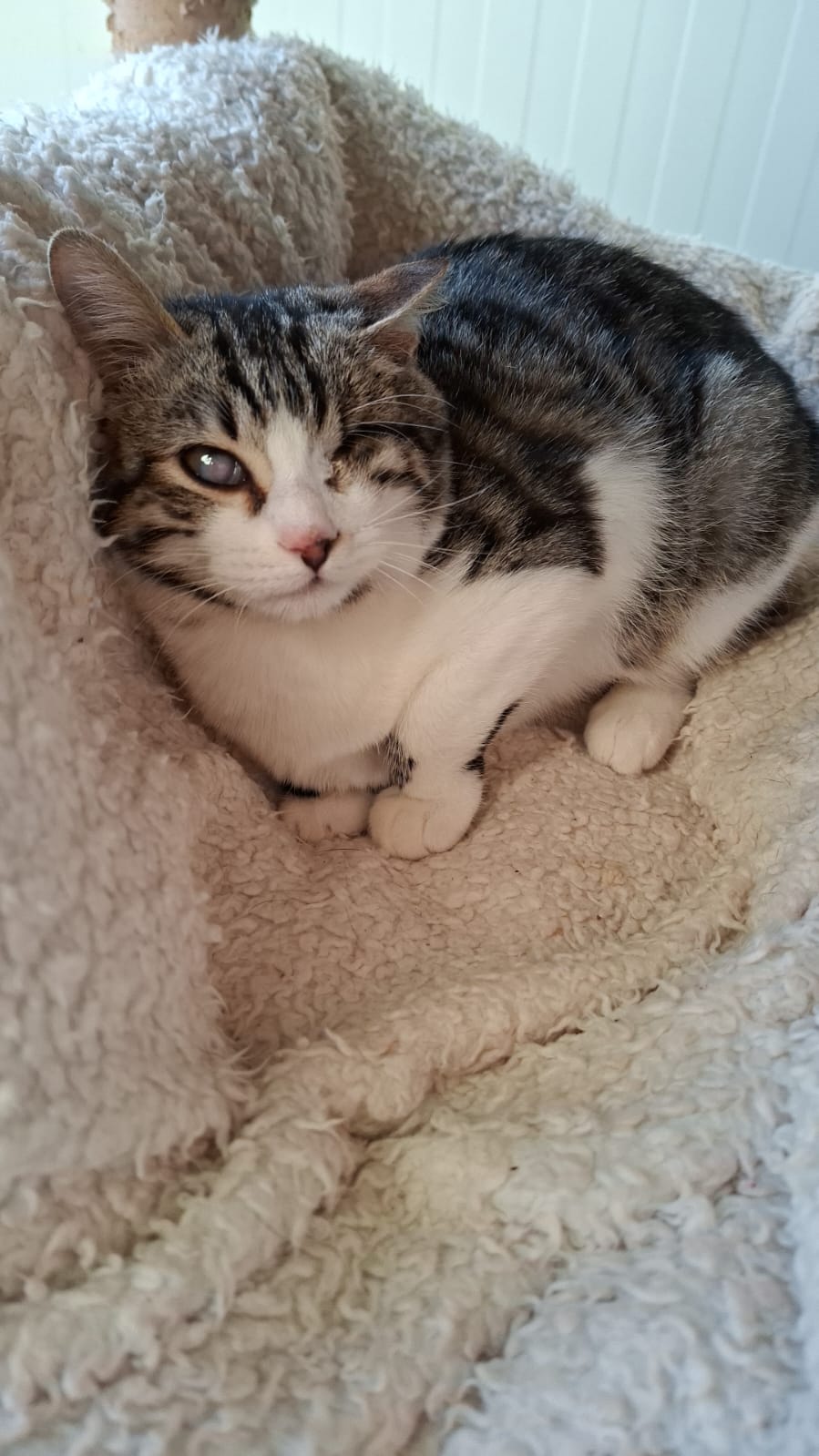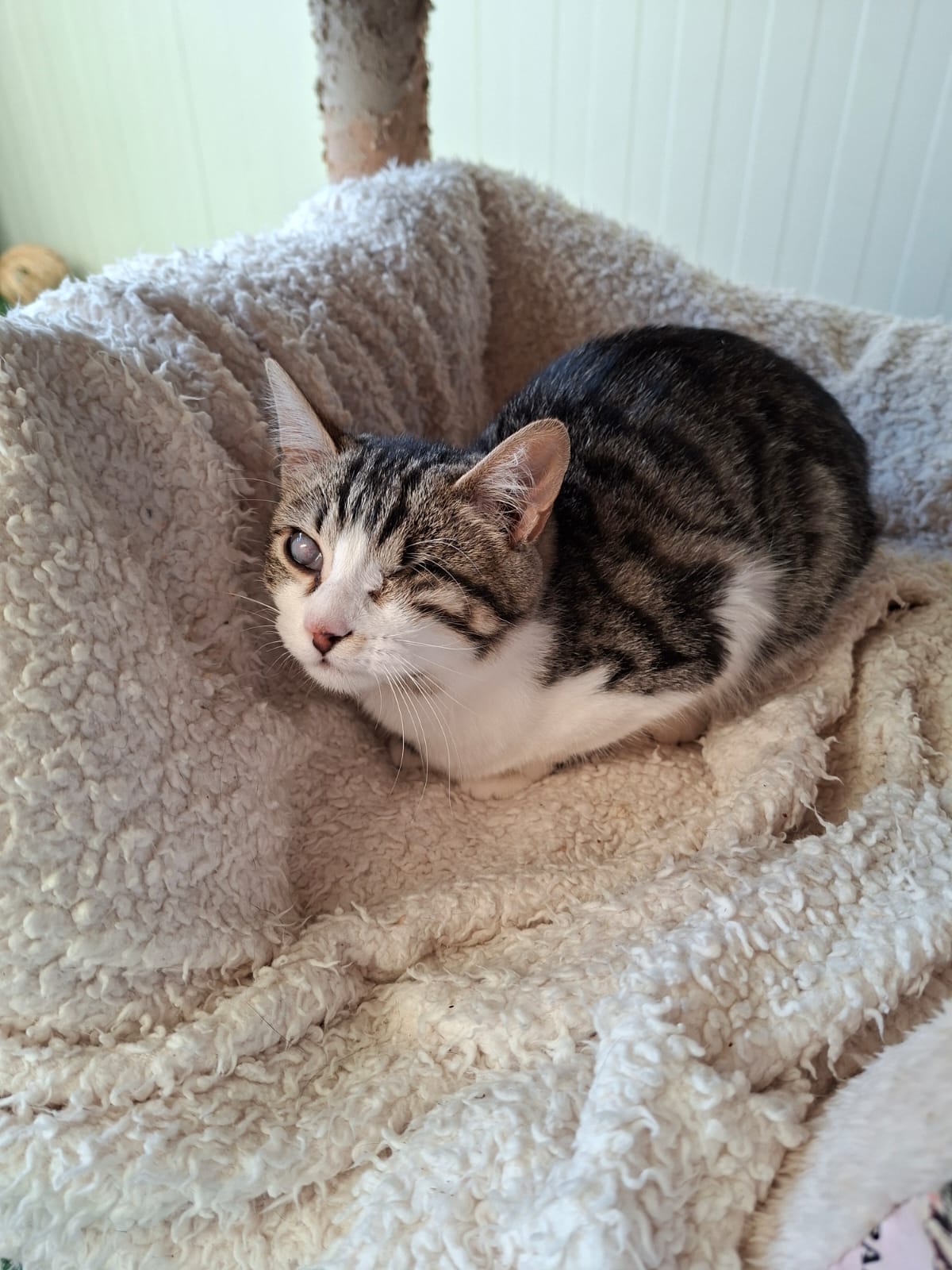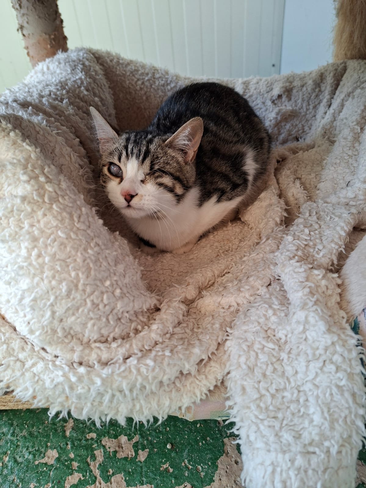 Ninja es aún una cachorra, es de agosto de 2025, llegó con los ojos muy mal y se llevo a la Clínica Veterinaria a enuclear un ojo y operar el otro.