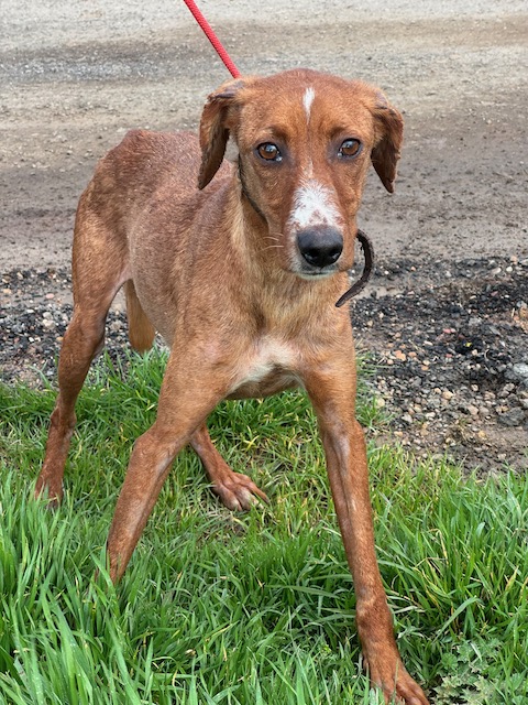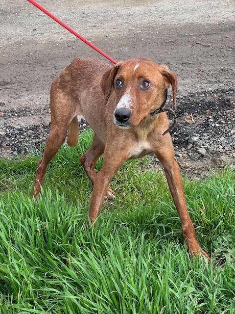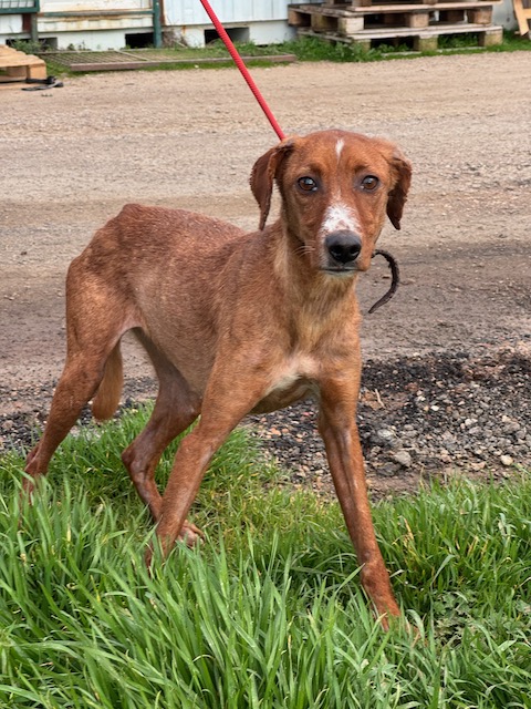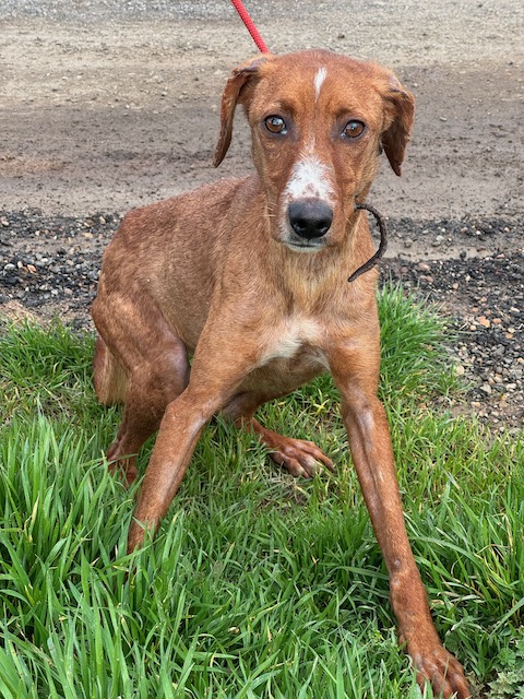 Llegó con sarna por todo el cuerpo y delgadez extrema. Tenía un miedo horrible, no se dejaba tocar, sólo temblaba. Poco a poco se ha acercando más, ha ganado peso y está prácticamente recuperada de su piel. Convive con otros perros sin problema