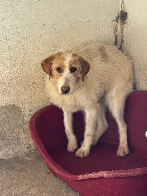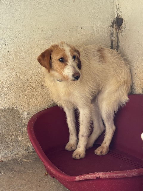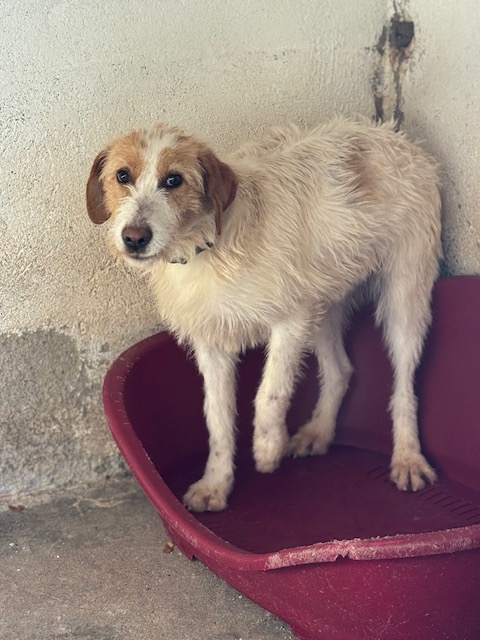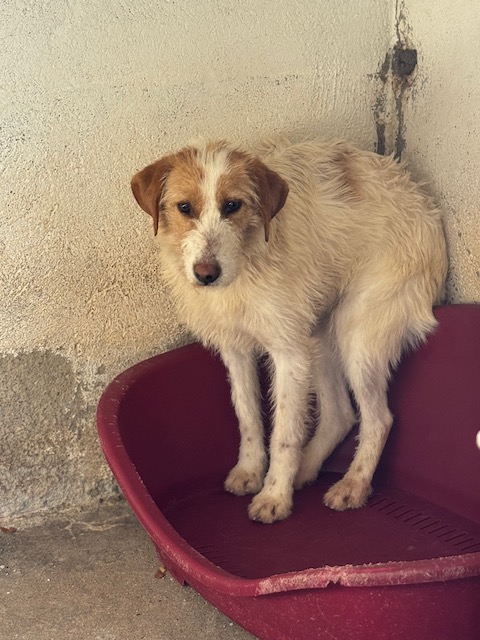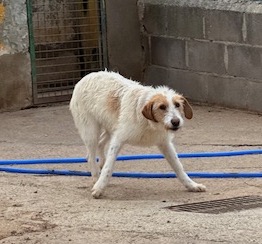 Tiene muchísimo miedo, aunque ya sale al patio con los otros perros sin problema y poco a poco se va acercando má.