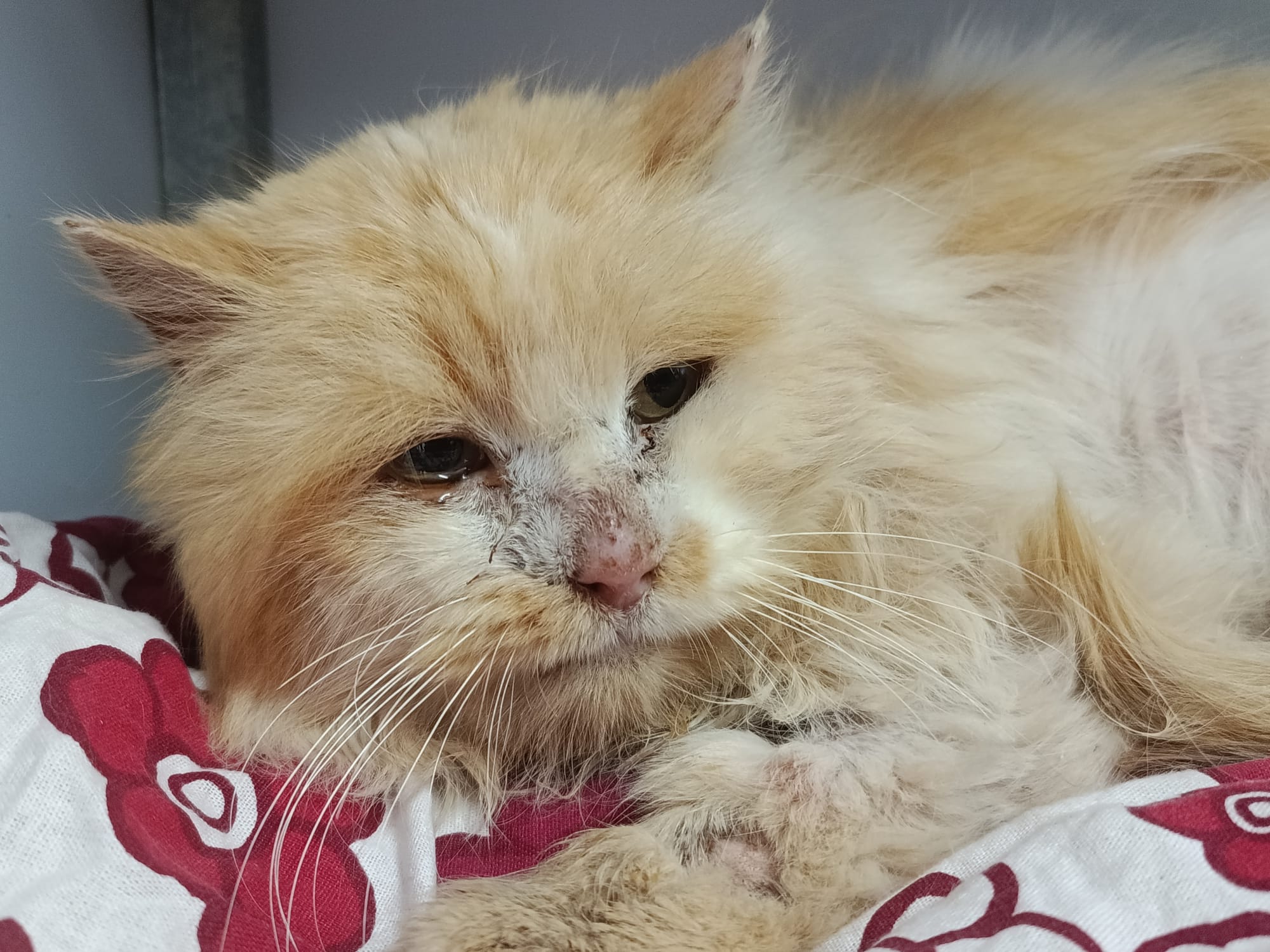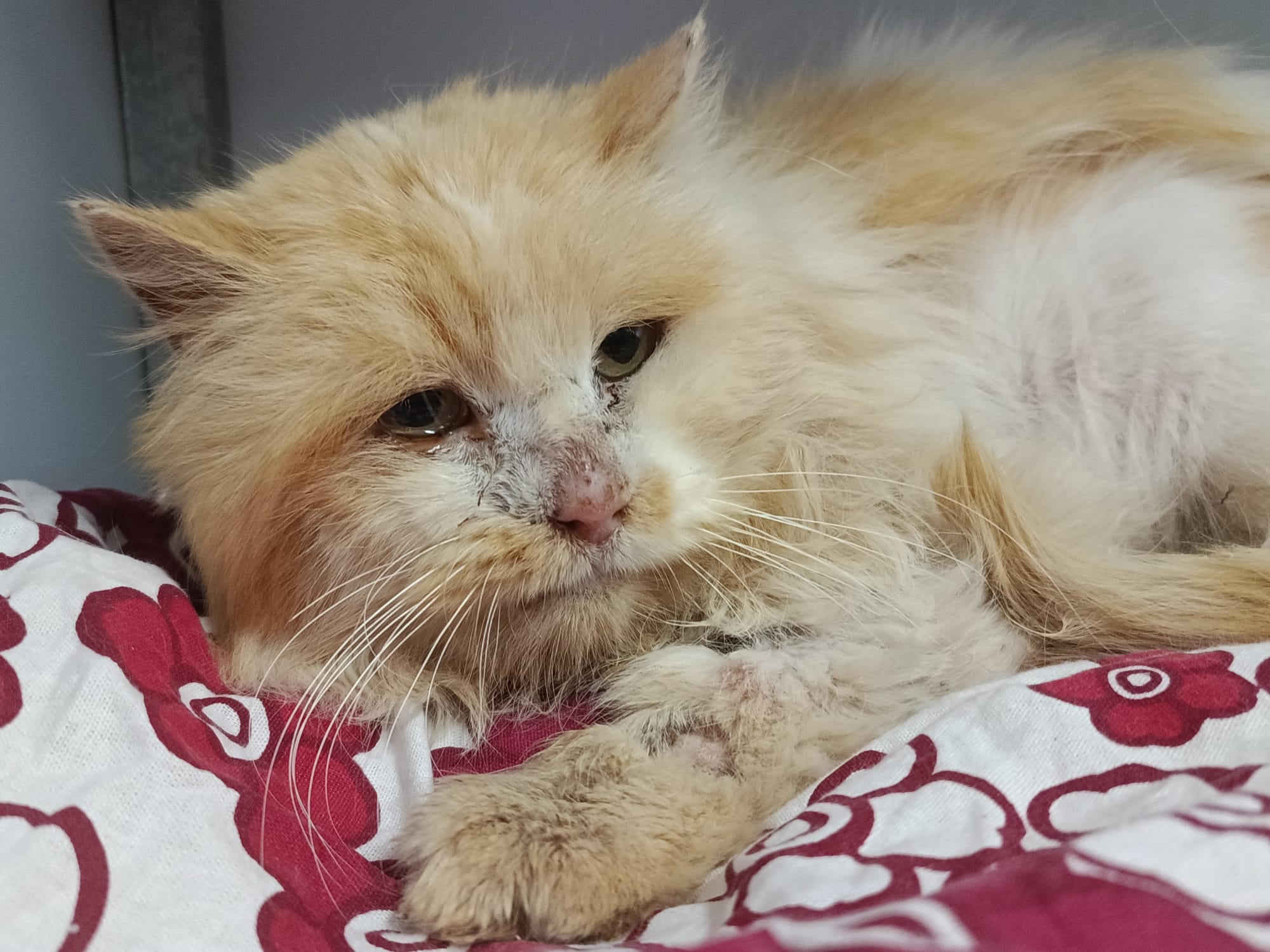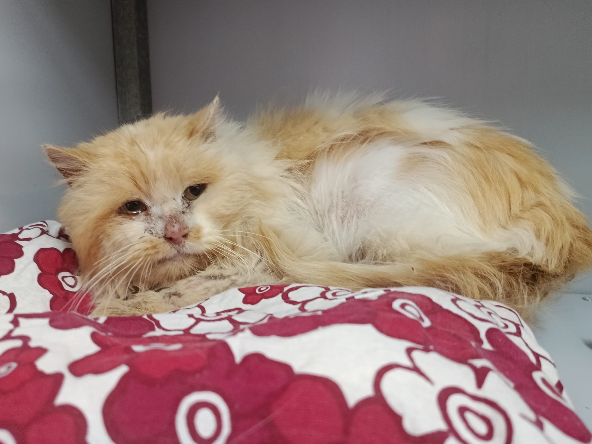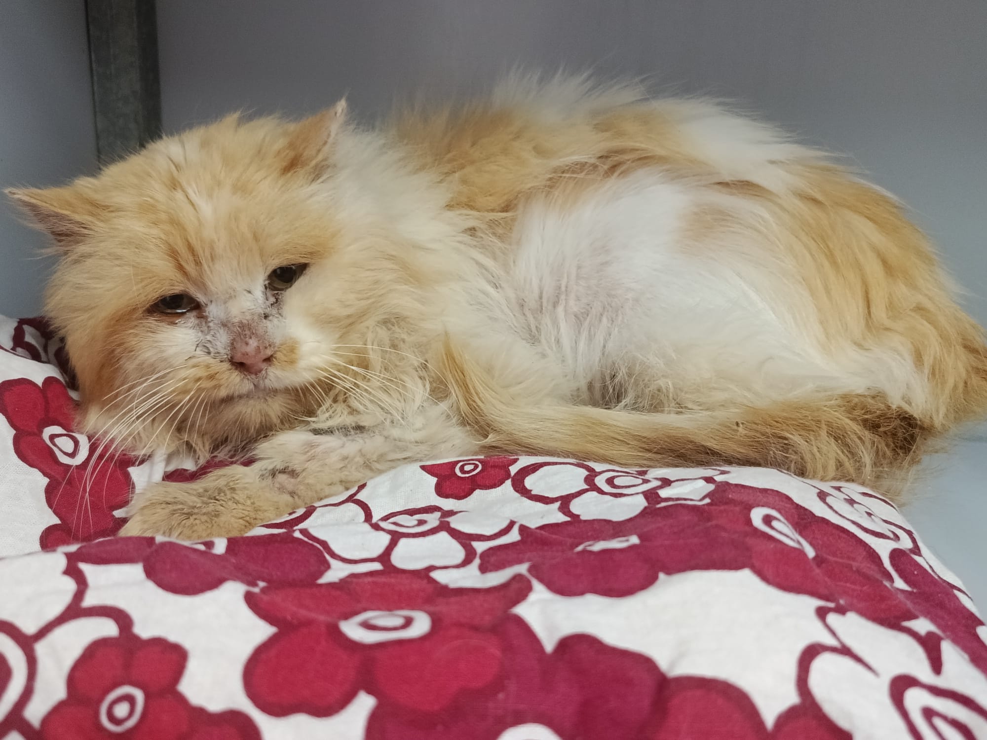 Pelusito es un gato buenísimo y preciso que nos ha llegado en unas condiciones lamentables, ya se está recuperando con los cuidados veterinarios y una buena alimentación.